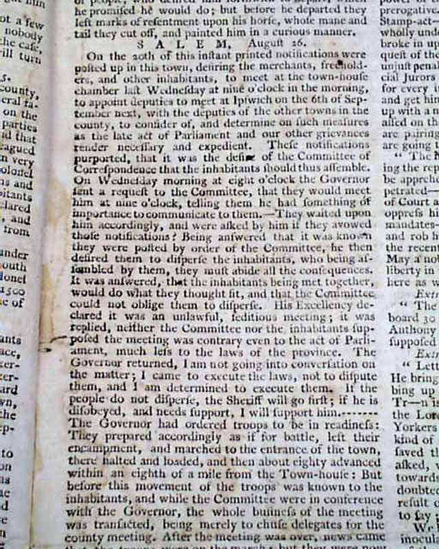 Also, a very notable "Proclamation" signed in type by Thomas Gage, noting: "Whereas certain hand-bills have been posted...in the town of Salem, calling upon the merchants...to meet at the town-house...to consider of, & determine upon measures for opposing the execution of divers late acts of Parliament...I do hereby strictly prohibit all persons from attending the aforesaid, or any other meeting...as they will be chargeable...and answer them at their utmost peril." with more.
