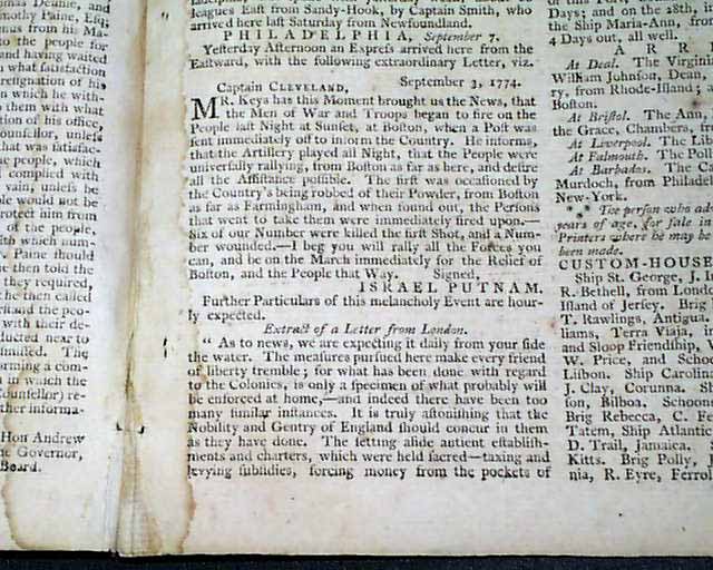Page 3 also has a report from New York which notes: "...that government has paid the Hon. the East India Company for the Tea, shipped, destroyed, stored in, or sent back from North America. The act imposing duties upon certain liquors, etc. imported into Quebec, we are informed, is to take place on the first day of May, 1775.," And an interesting item signed by Israel Putnam notes in part: "...brought the news that the men of war & troops began to fire on the people last night at sunset, at Boston, when a post was sent immediately off to inform the country...the people were universally rallying, from Boston as far as here, & desire all the assistance possible..." with more. Even better content as well.