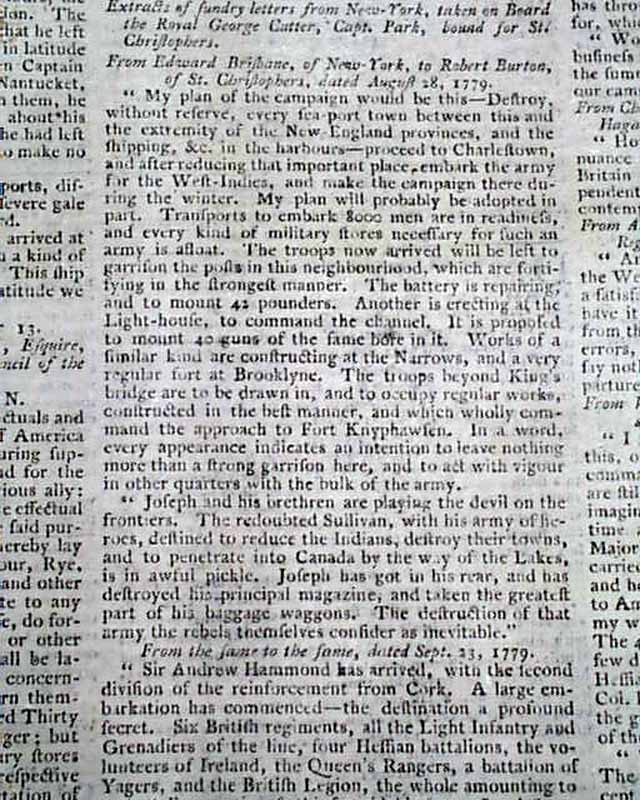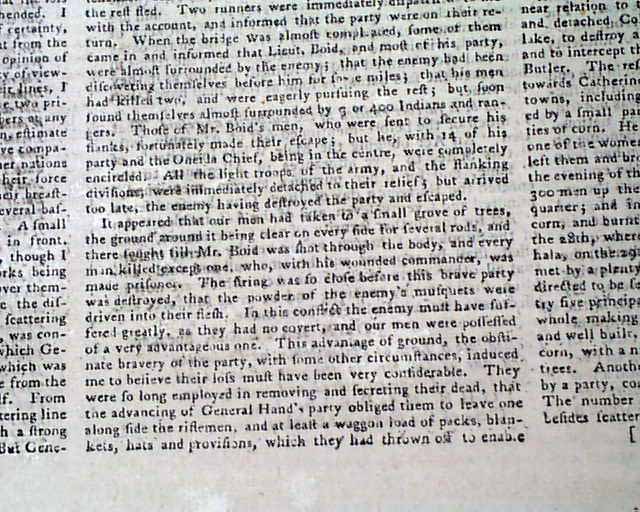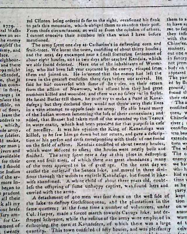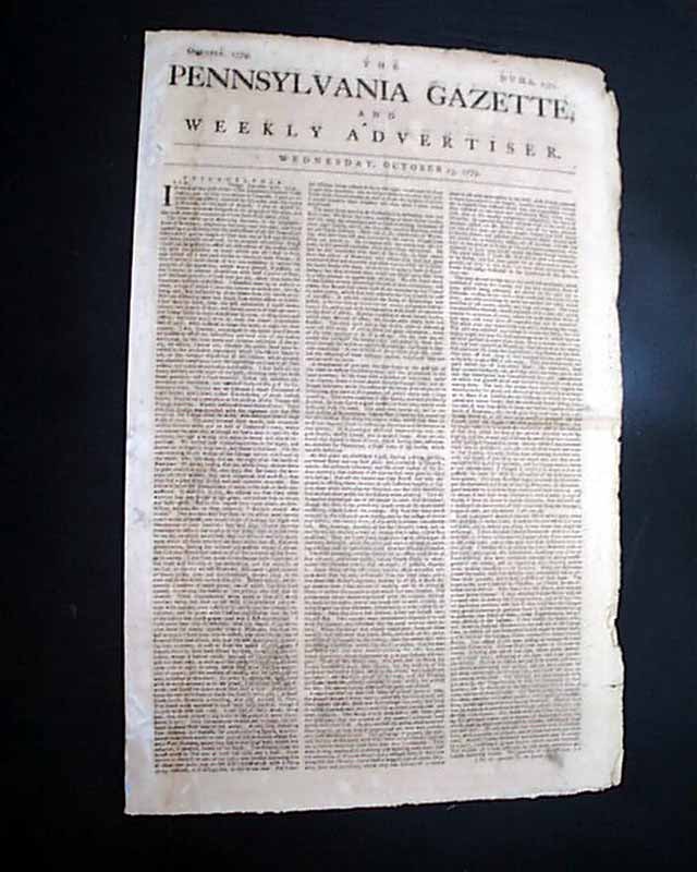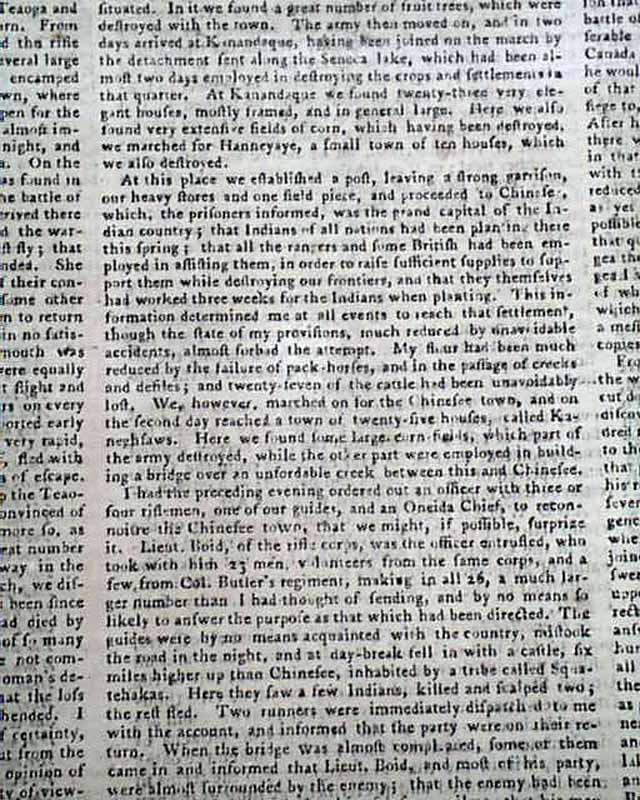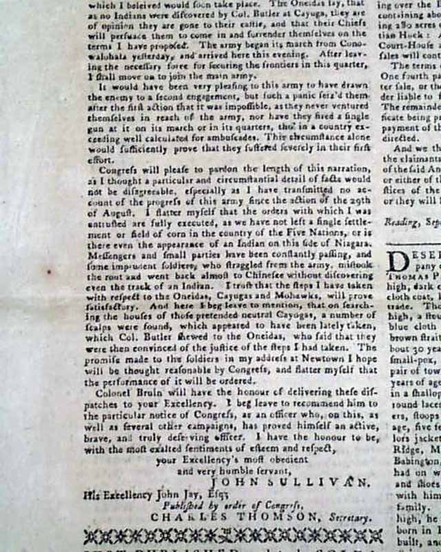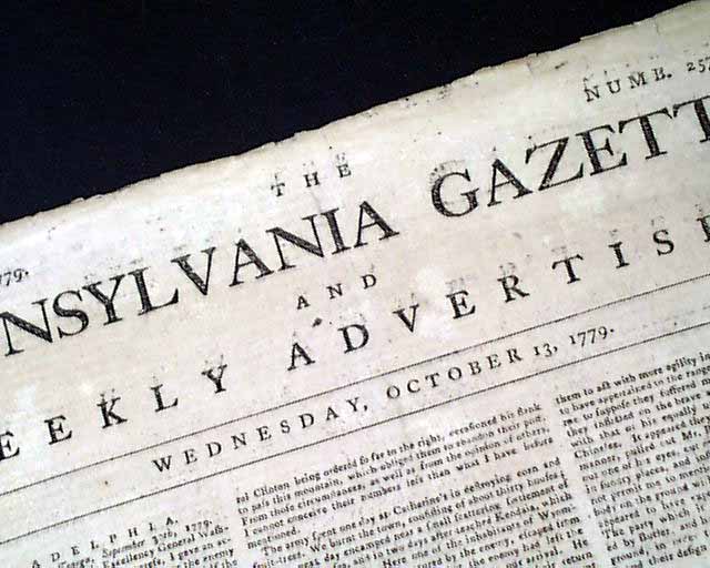 THE PENNSYLVANIA GAZETTE & WEEKLY ADVERTISER, Philadelphia, Oct. 13, 1779 The entire front page and part of the back page are taken up with a very fine & detailed account of the Sullivan Expedition. The report is signed in type by John Sullivan, who commanded the expedition.