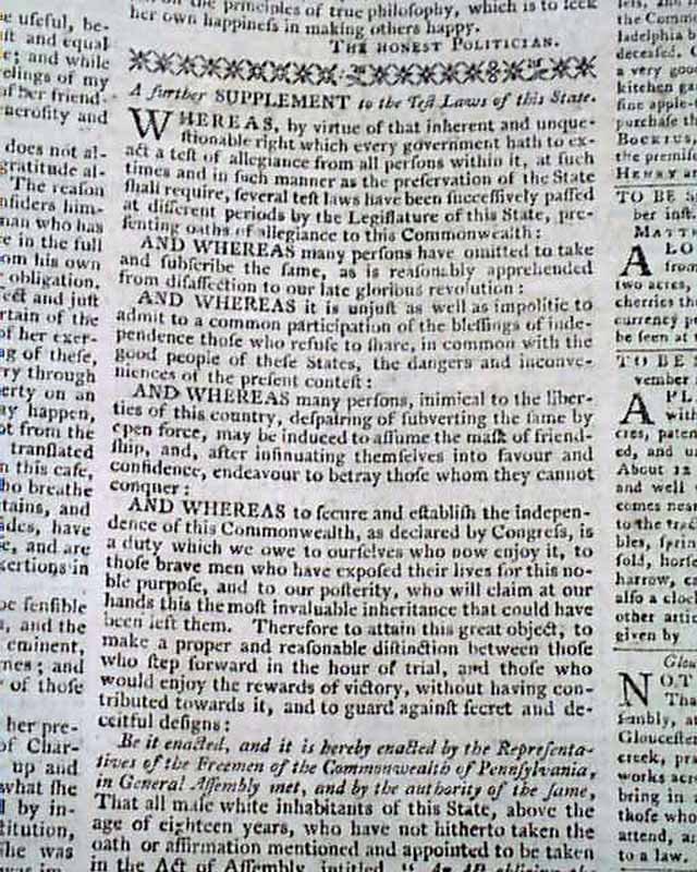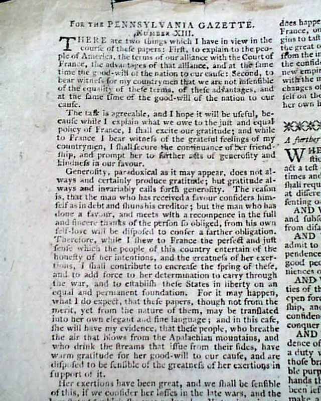 This is the newspaper that was once owned & operated by Ben Franklin, his name included in the imprint until 1765.