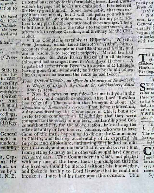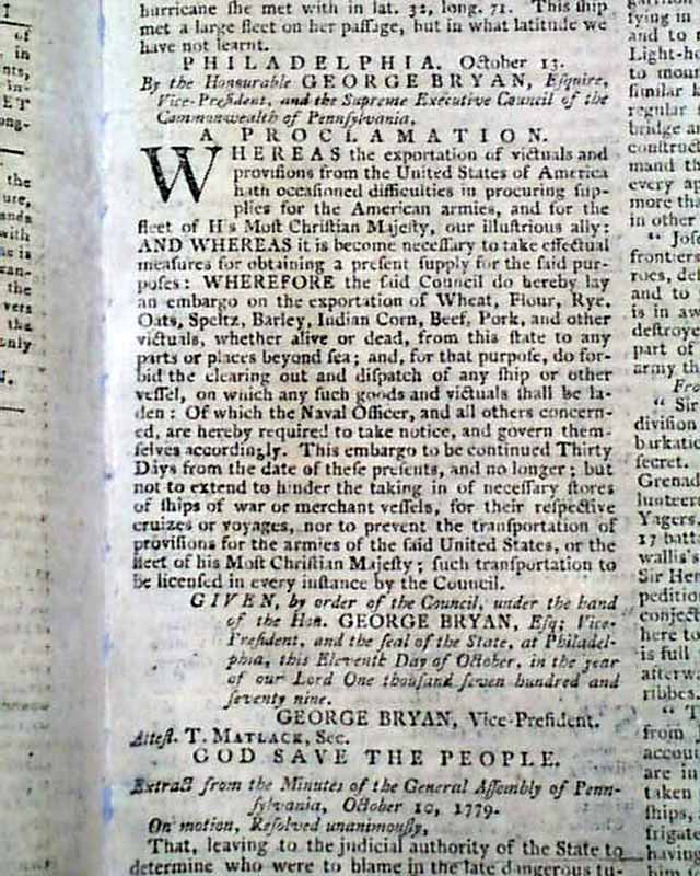Other war-related reports inside, most seen in the photos, including a "Proclamation" concerning an embargo relating to the difficulty of soldiers procuring supplies; A letter that begins: "My plan off the campaign would be this--Destroy, without reserve, every seaport town between this and the extremity of the New England province, and the shipping, etc. in the harbours--proceed to Charlestown..." with more.