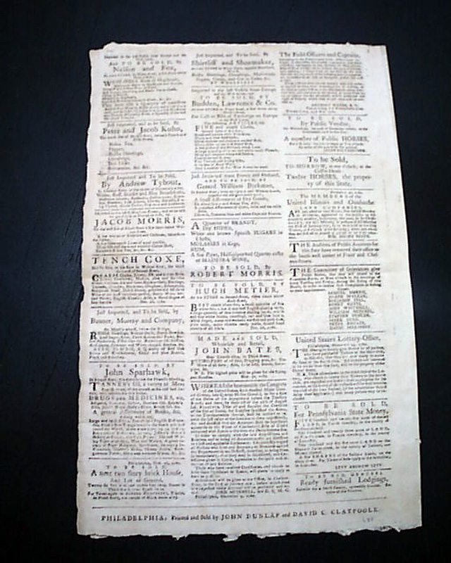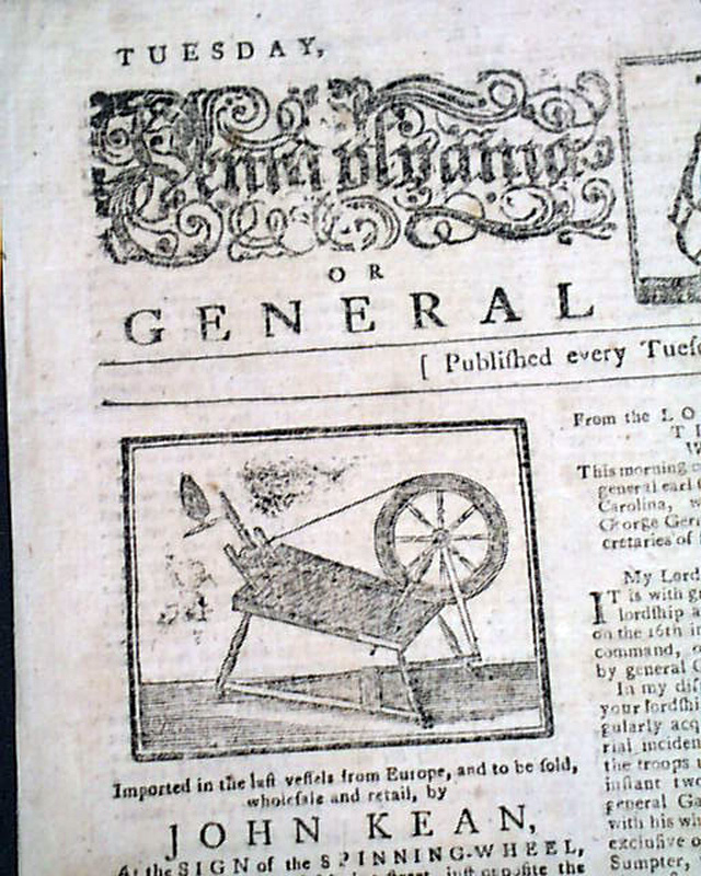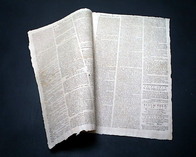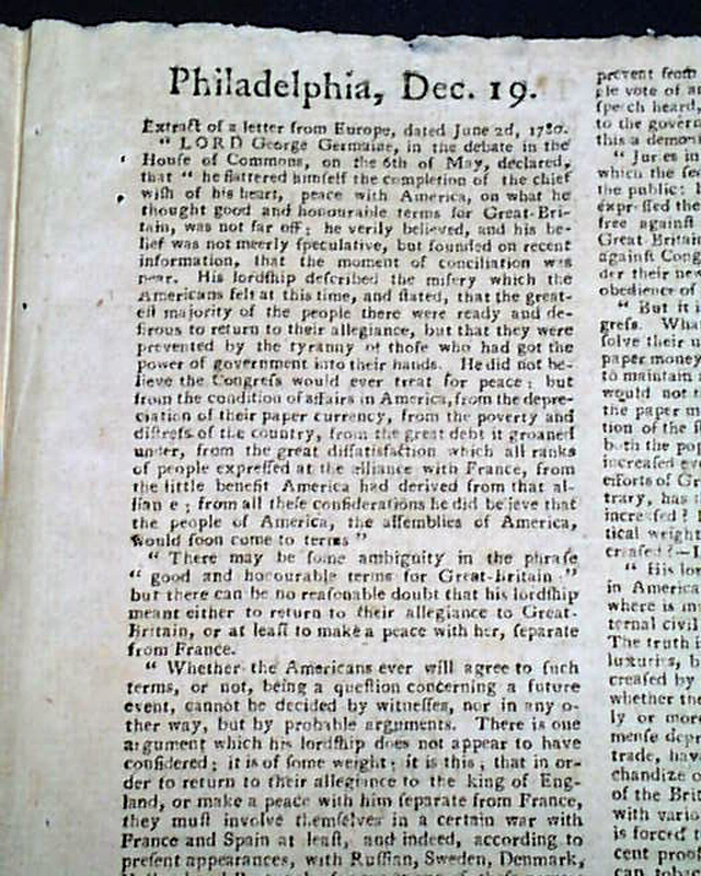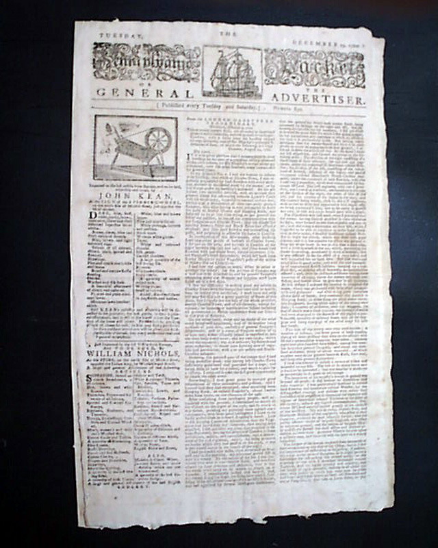 THE PENNSYLVANIA PACKET OR THE GENERAL ADVERTISER, Philadelphia, Dec. 19, 1780 See the photos for the very handsome masthead which features ornate lettering and an engraving of a ship.