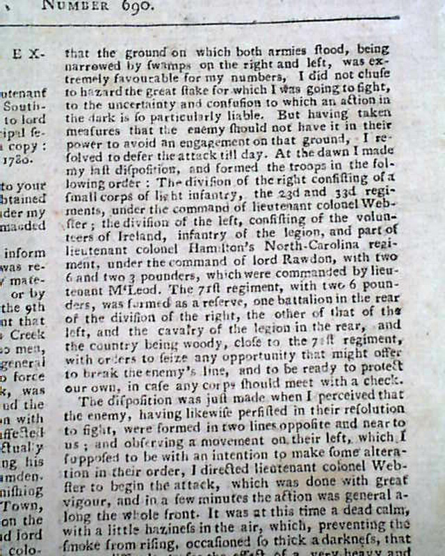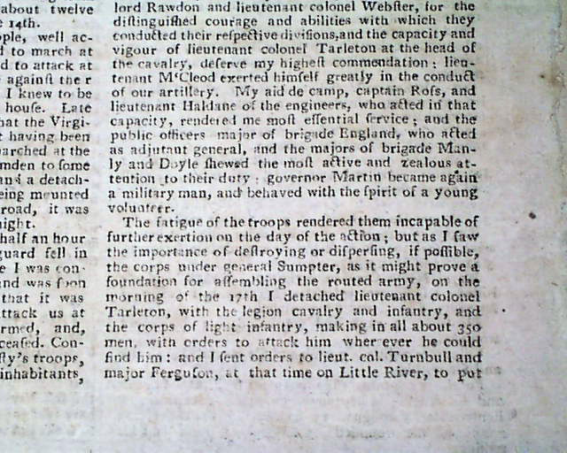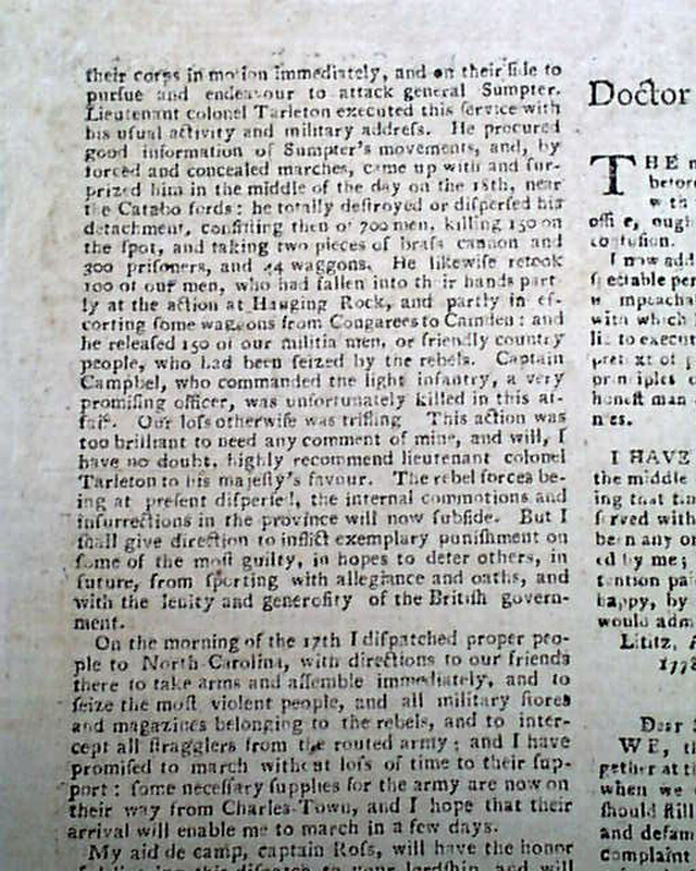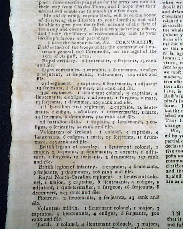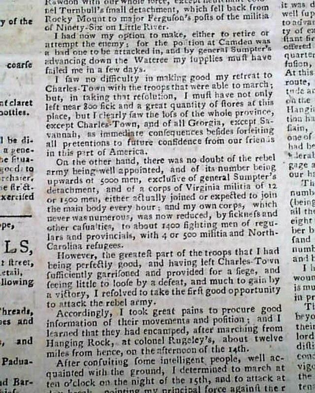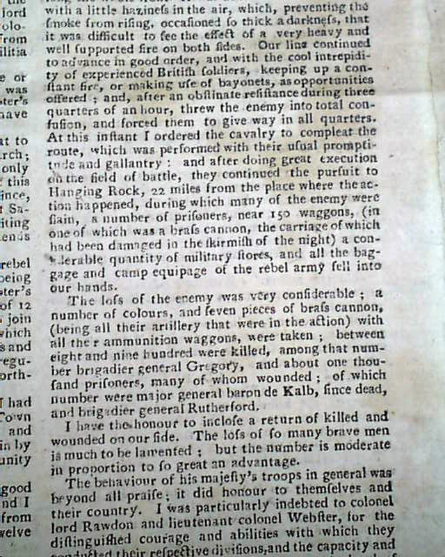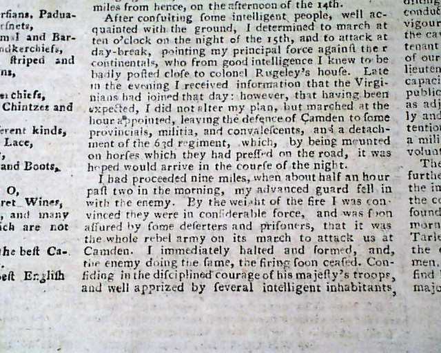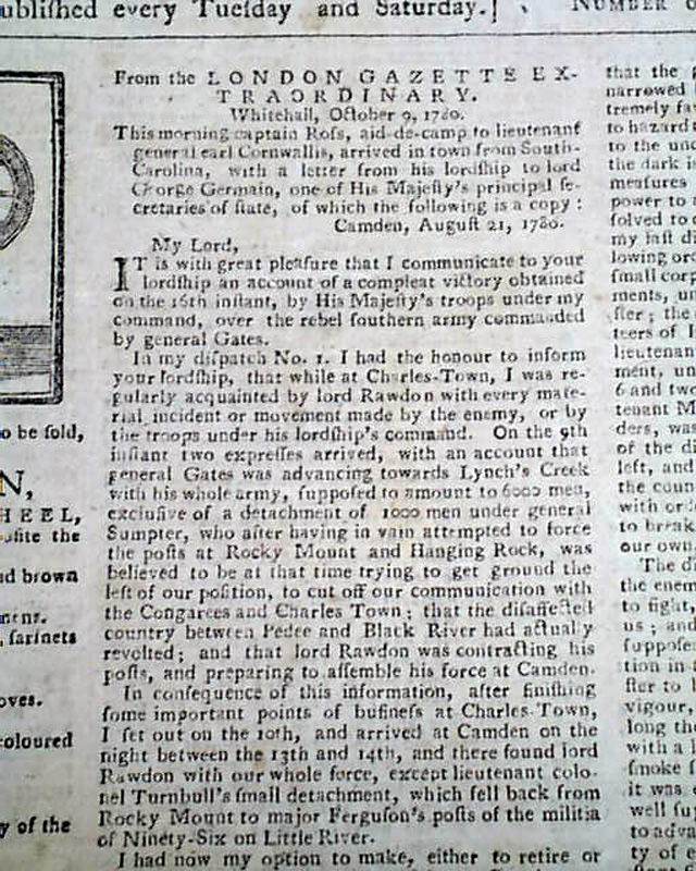 A great issue as two-thirds of the front page and one-third of page 2 are taken up with the details of the Battle of Camden, South Carolina. The report is taken from the "London Gazette Extraordinary".