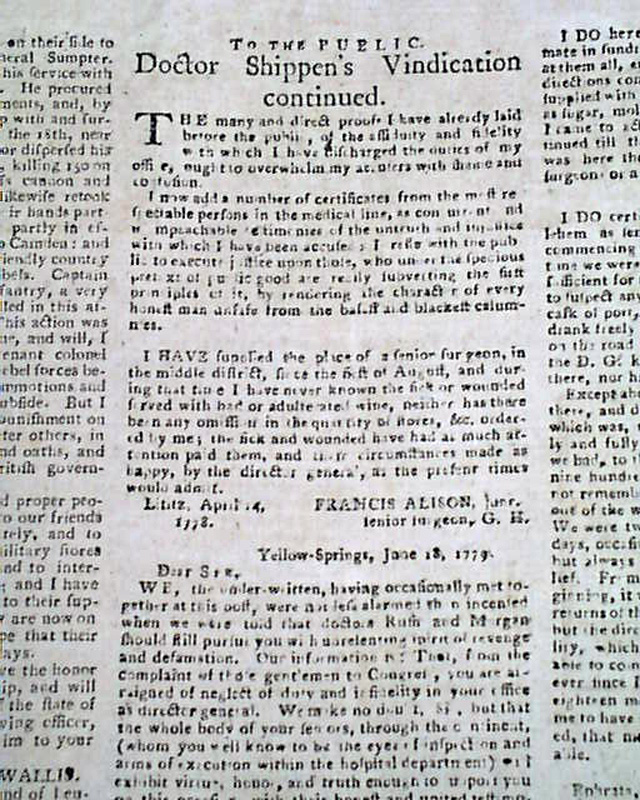 Over a full column on page 2 is taken up with: "Doctor Shippen's Vindication" concerning the handling of the military department of the Continental Army.
