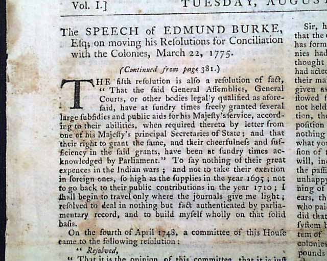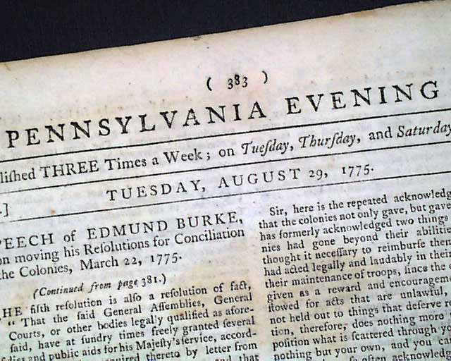 THE PENNSYLVANIA EVENING POST, Philadelphia, Aug. 29, 1775 All of the front page & most of page 2 are taken up with a continuation of: "The Speech of Edmund Burke on Moving his Resolutions for Conciliation with the Colonies, March 22, 1775." which includes a historical perspective.