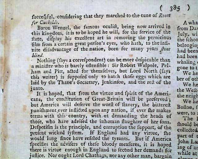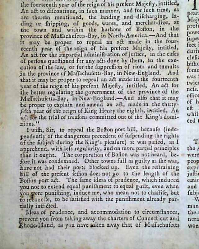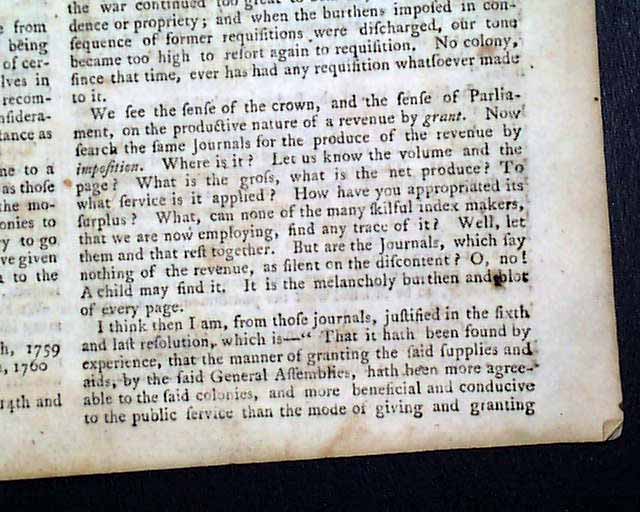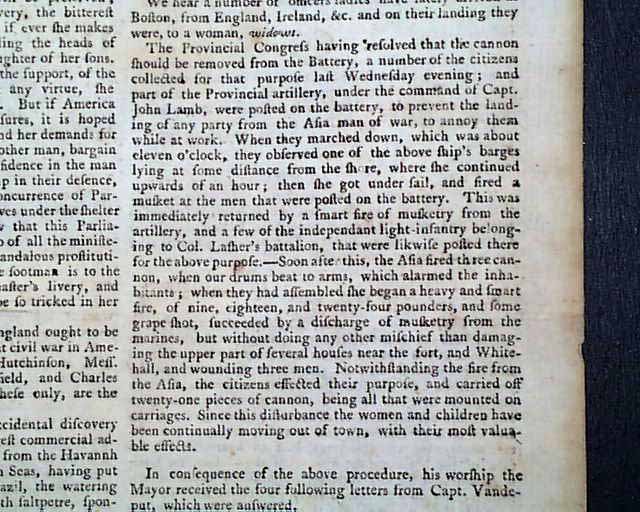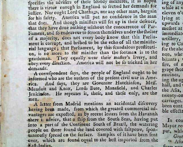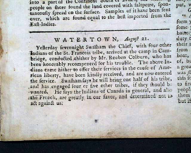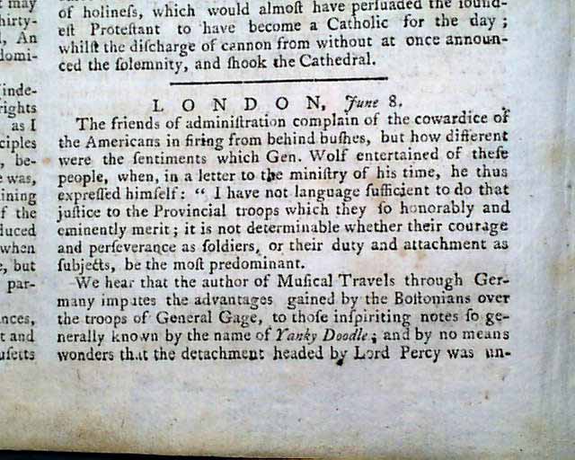 A page 2 report from London begins: "The friends of administration complain of the cowardice of the Americans in firing from behind bushes...I have not language sufficient to do justice to the Provincial troops which they so honorably & eminently merit..." and also a note that: "...the author of Musical Travels through Germany impates the advantages gained by the Bostonians over the troops of General Gage to those inspiriting notes so generally known by the name of Yanky Doodle...". A nice pg. 3 report includes: "It is hoped that from the virtue & spirit of the Americans the constitution of Great Britain will be preserved; but America will deserve the worst of slavery, the bitterest punishment ever inflicted upon any nation if ever she makes terms with this country without demanding the heads of those who have advised the inhuman slaughter of her sons..." with more. Also a report of Indians coming into Watertown to offer their support for the American cause.