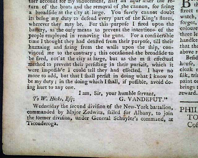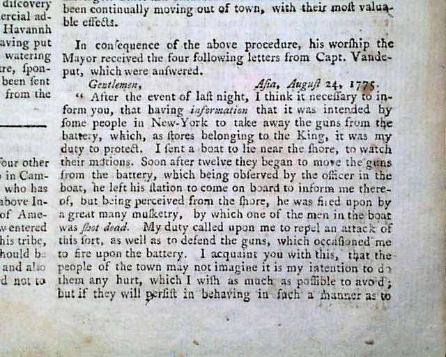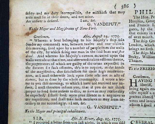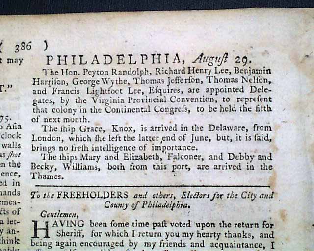 Page 3 also has two nice reports on the firing upon New York City by the British ship Asia with more reports carrying over to take half of the bkpg. as well. The back page contains a list of the delegates recently elected from Virginia to attend the Continental Congress & includes the name Thomas Jefferson--quite early for his name to appear in a period newspaper.