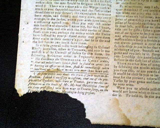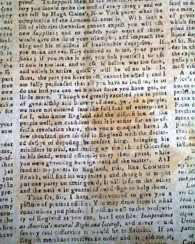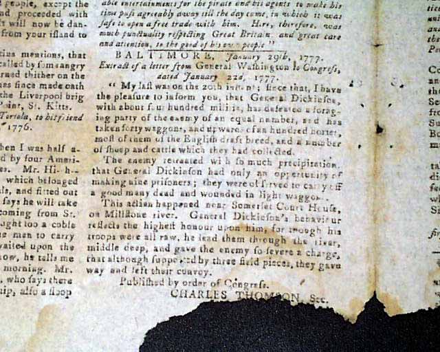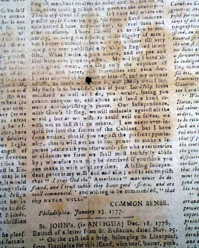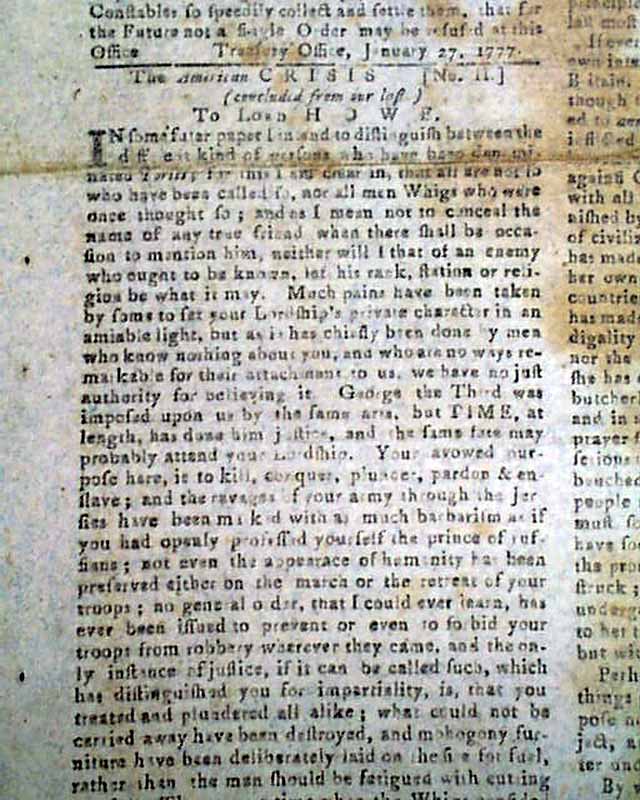 This is about 60% of this essay, the earlier portion having appeared in an earlier issue of this title. It continues to take over half of page 2 where it is signed in type "Common Sense" and dated at Philadelphia, January 13, 1777. Included with this issue is a printing of the entire text of Essay #2 which includes that portion lacking in this newspaper.