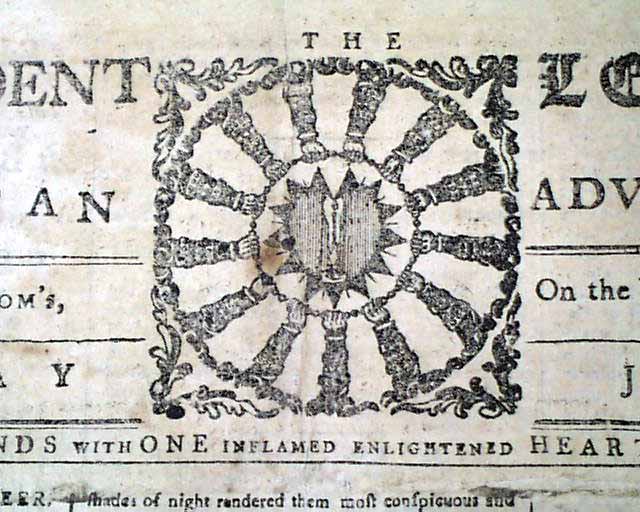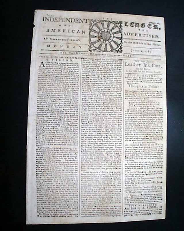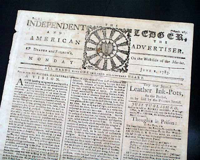 INDEPENDENT LEDGER, AND AMERICAN ADVERTISER, Boston, June 2, 1783 One of the best features of this issue is the masthead engraving which features a very patriotic theme: "All Hands with One Inflamed Enlightened Heart." signifying the 13 united colonies having a common, patriotic purpose. One of the more patriotic masthead engravings of the Revolutionary War era.