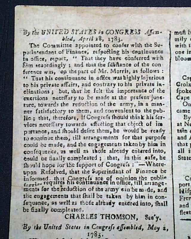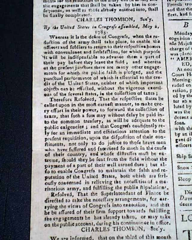 Page 2 has a document from the United States Congress beginning: "Whereas it is the desire of Congress, when the reduction of the army shall take place, to enable the officers and soldiers to return to their respective homes with conveniences and satisfaction..." with much more, signed in type: Charles Thomson as Secretary of Congress.