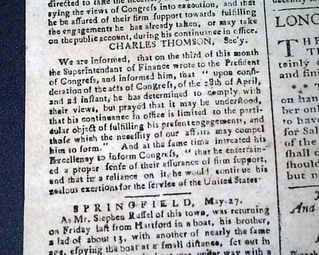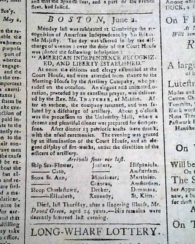 Page 2 has a report from Boston beginning: "Monday last was celebrated at Cambridge the recognition of American Independence by his Britannic Majesty. The day was ushered in by the discharge of cannon..." with more on the celebration.
