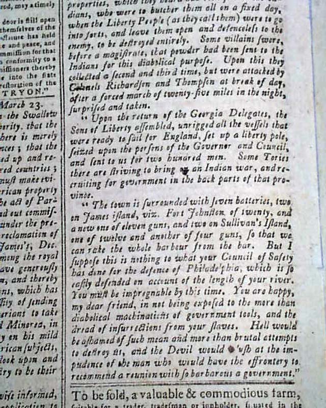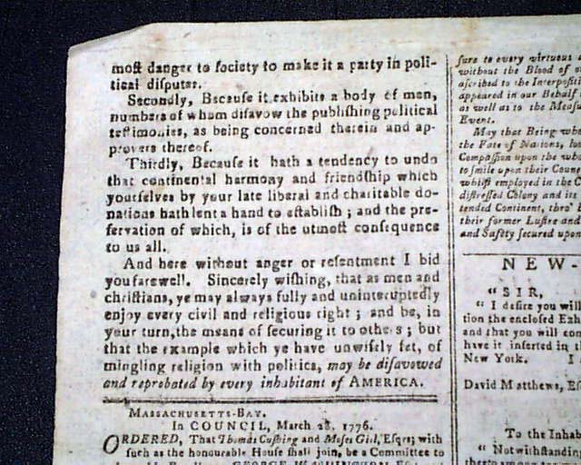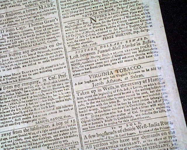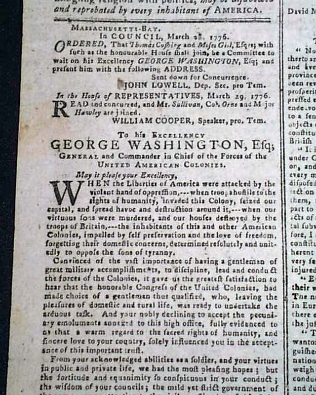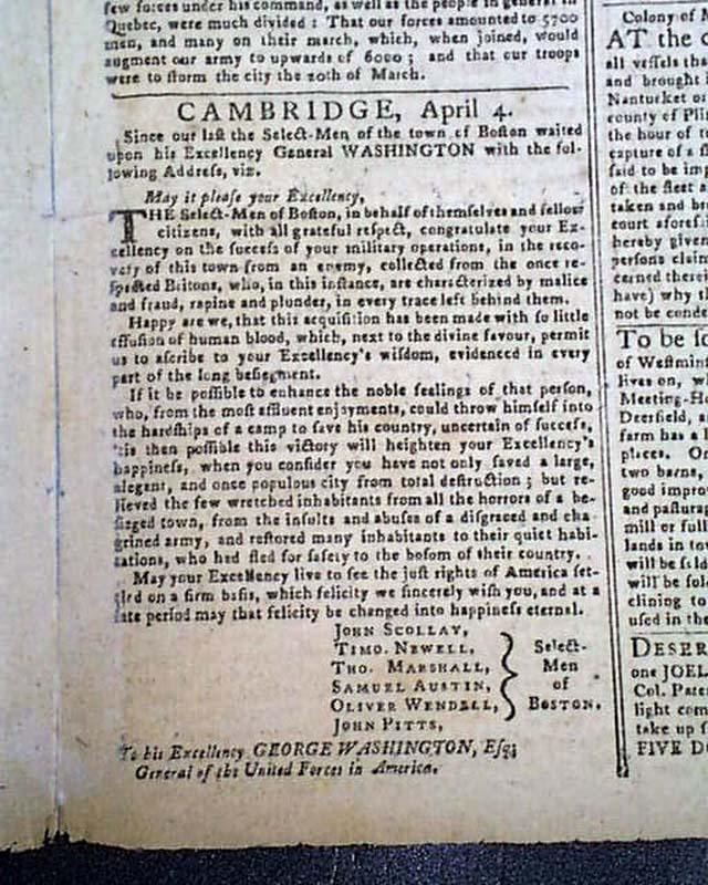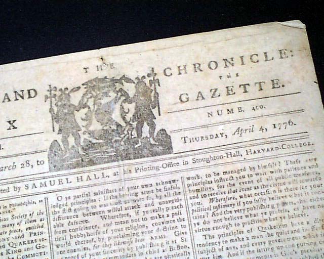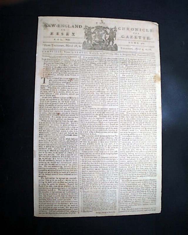 NEW-ENGLAND CHRONICLE: OR THE ESSEX GAZETTE, April 4, 1776  A wealth of fine content in this issue from this desirable year.