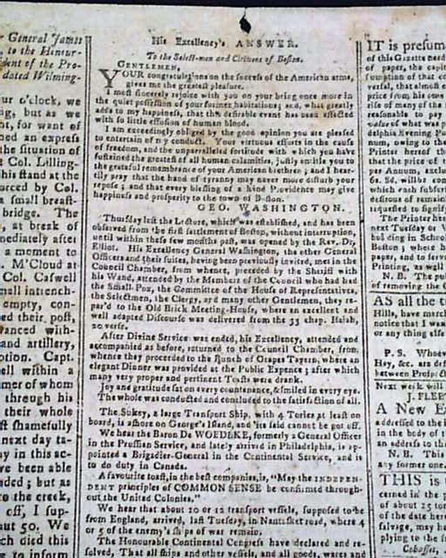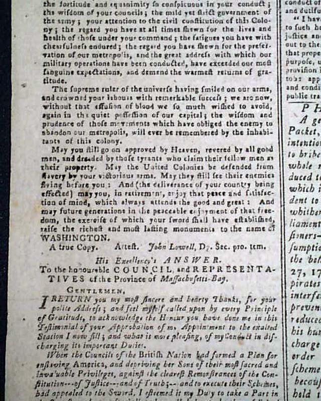 Page 3 has an address to Washington from the Mass. "Select Men" offering thanks for: "...the success of your military operations in the recovery of this town from an enemy...". He responds to this address with: "His Excellency's Answer" to the Selectmen of Boston, signed in type: Geo. Washington.