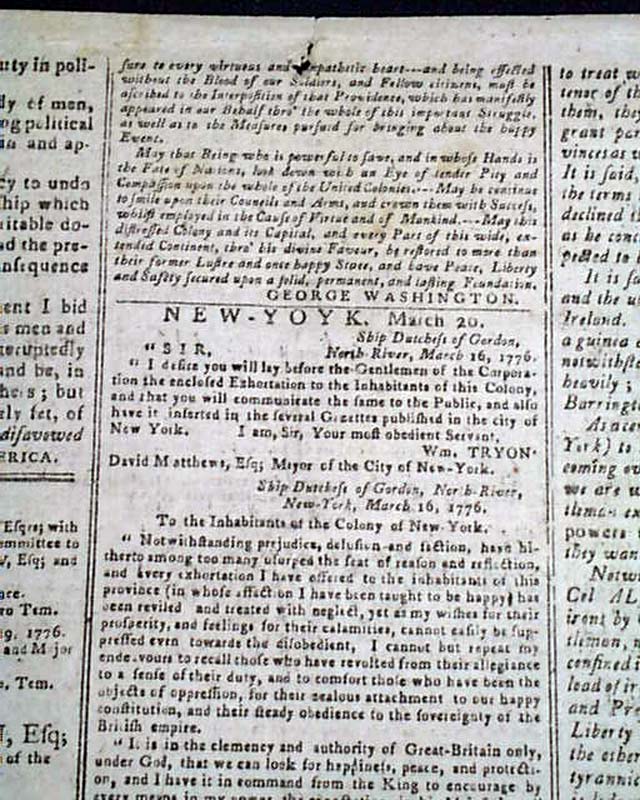 Then an interesting letter from the Royal governor of New York, William Tryon, who at the time sought refuge from the colonists and moved his office offshore in the ship Duchess of Gordon. From here he would dissolve the N. Y. Assembly because they advocated for independence.