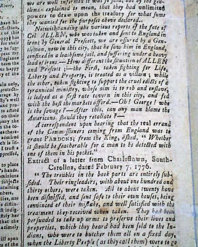 Then a report concerning Ethan Allen and his capture by the British, noting in part: "...the various reports of the fate of Col. Allen, who was taken & sent to England irons by General Prescott...saw him in England, confined in a loathsome jail & suffering under a heavy load of irons..." with more
