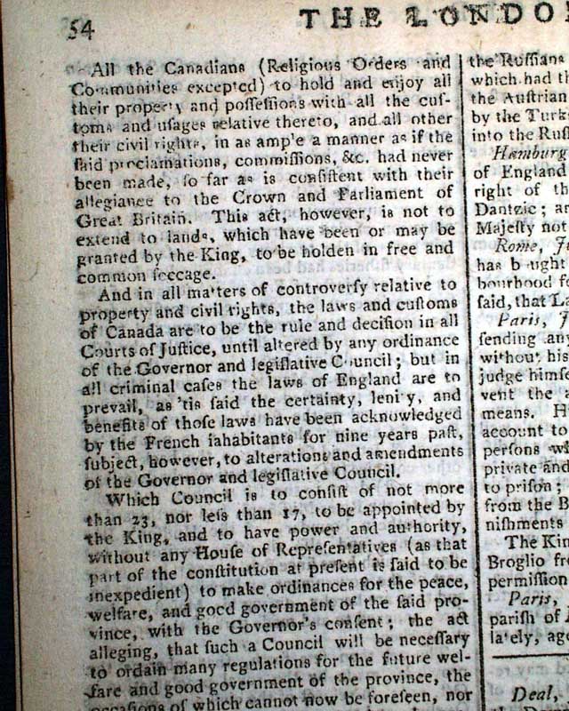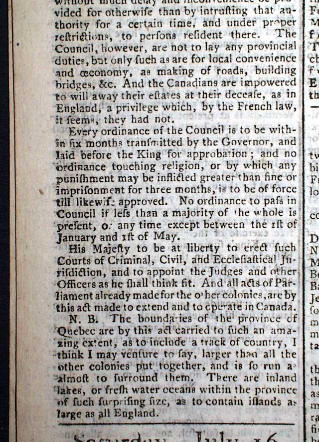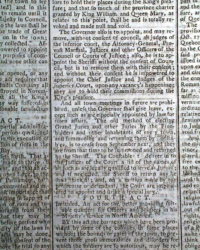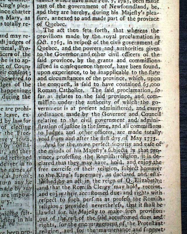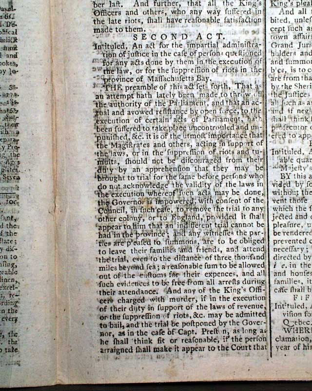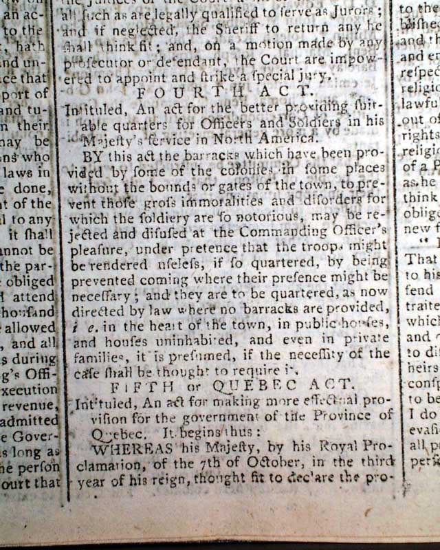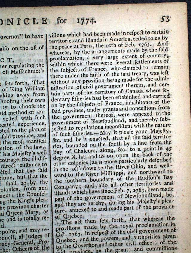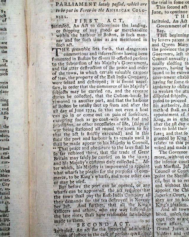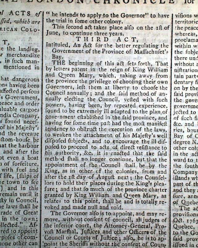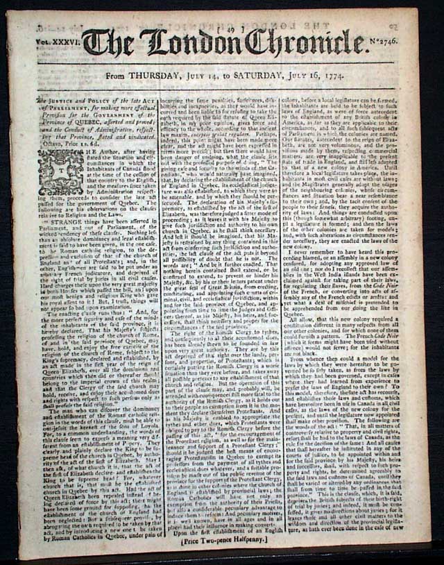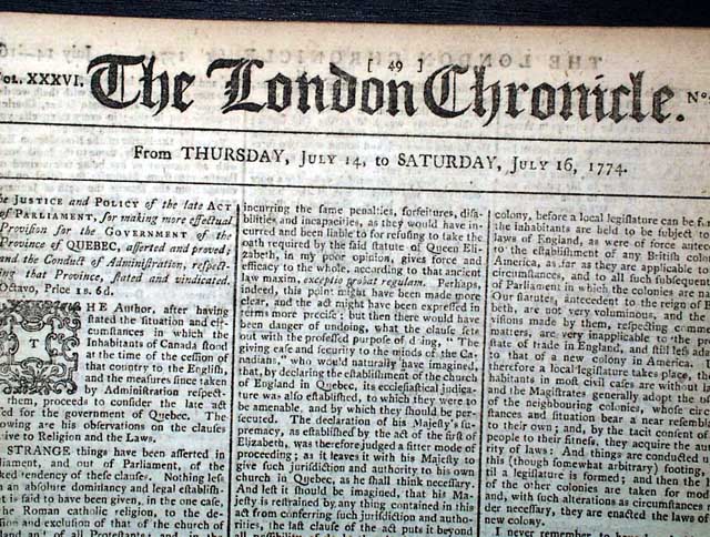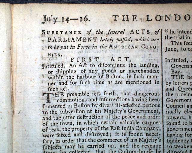 THE LONDON CHRONICLE, England, July 16, 1774 This is one of the better issues from just before the outbreak of the Revolutionary War, as page 5 contains the complete printing of all 5 of the Coercive Acts, or as known in the colonies as "The Intolerable Acts".