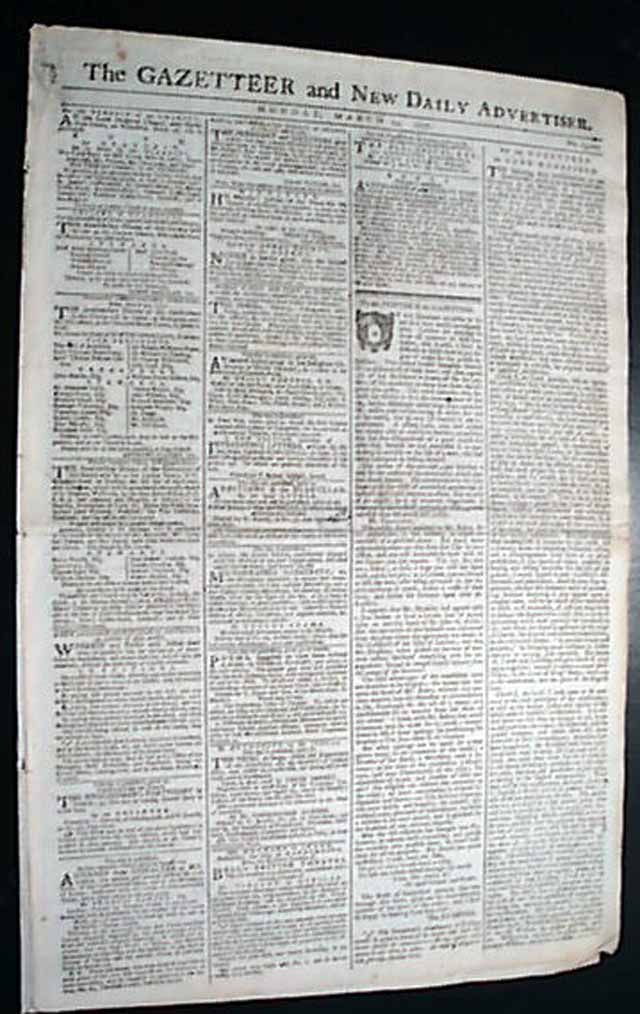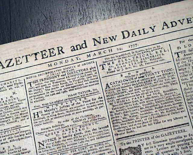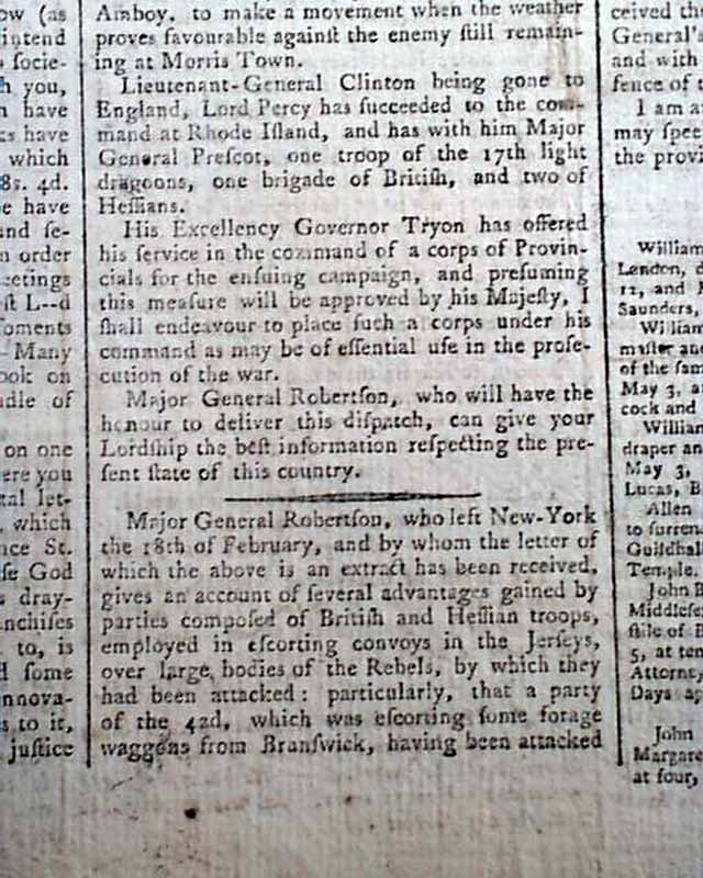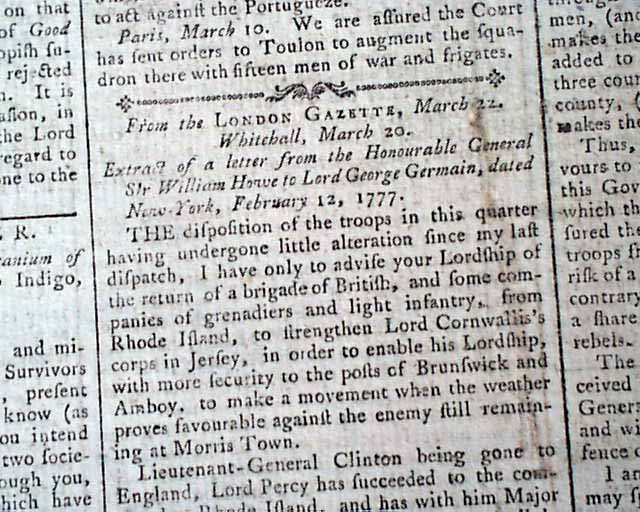 THE GAZETTEER & NEW DAILY ADVERTISER, London, Mach 24, 1777 Page 2 has an extract of a letter from General Sir William Howe to Lord George Germain dated at New York, Feb. 12, 1777 providing an update of the British forces in that region.
