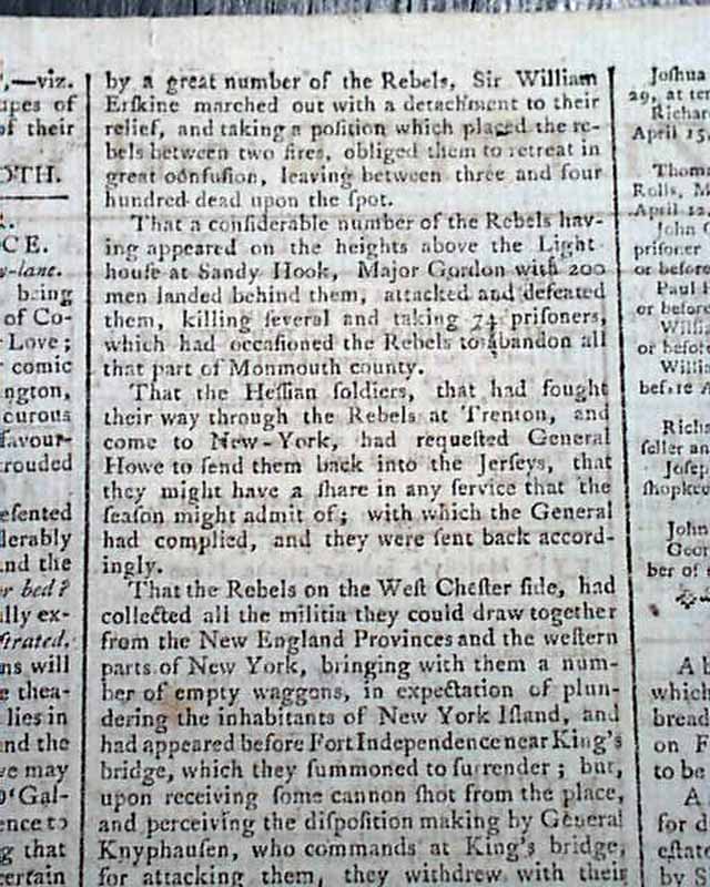 Then a report noting: "...gives an account of several advantages gained by parties composed of British & Hessian troops...over large bodies of the Rebels by which they had been attacked..." with further particulars.