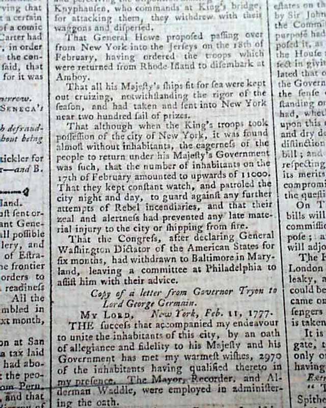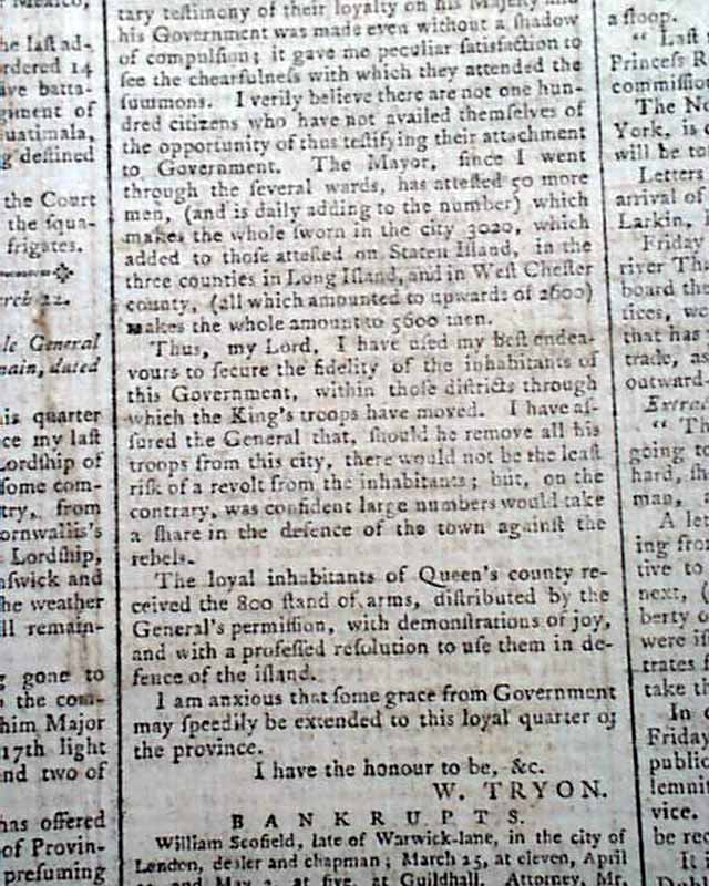 There is a letter from Governor Tryon at New York, to Lord George Germain, beginning: "The success that accompanied my endeavor to unite the inhabitants of this city by an oath of allegiance & fidelity to his Majesty...has met my warmest wishes, 2970 of the inhabitants having qualified..." with more on this, signed: W. Tryon.