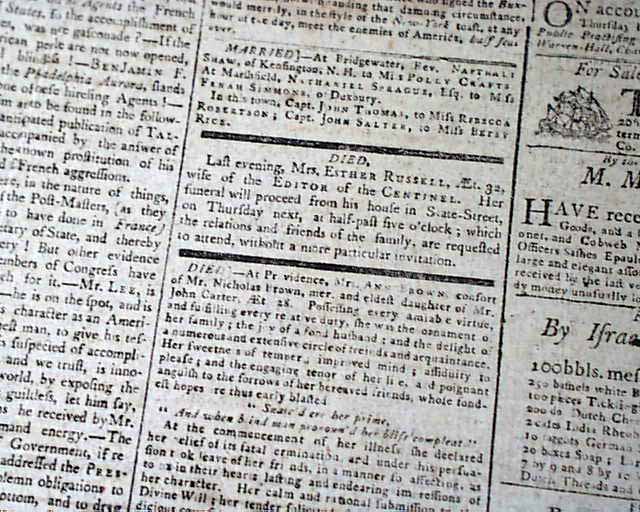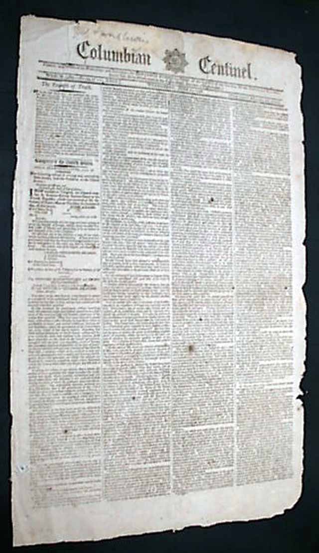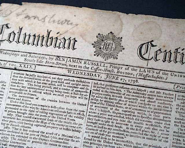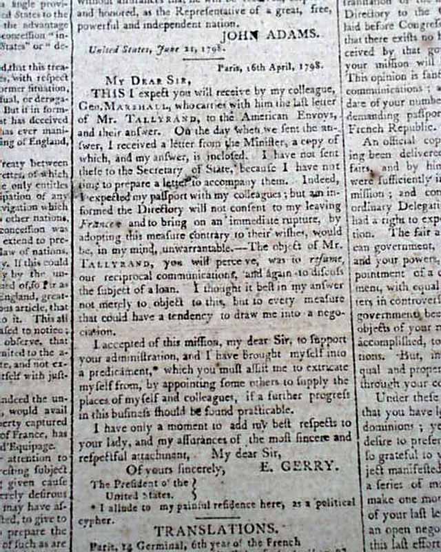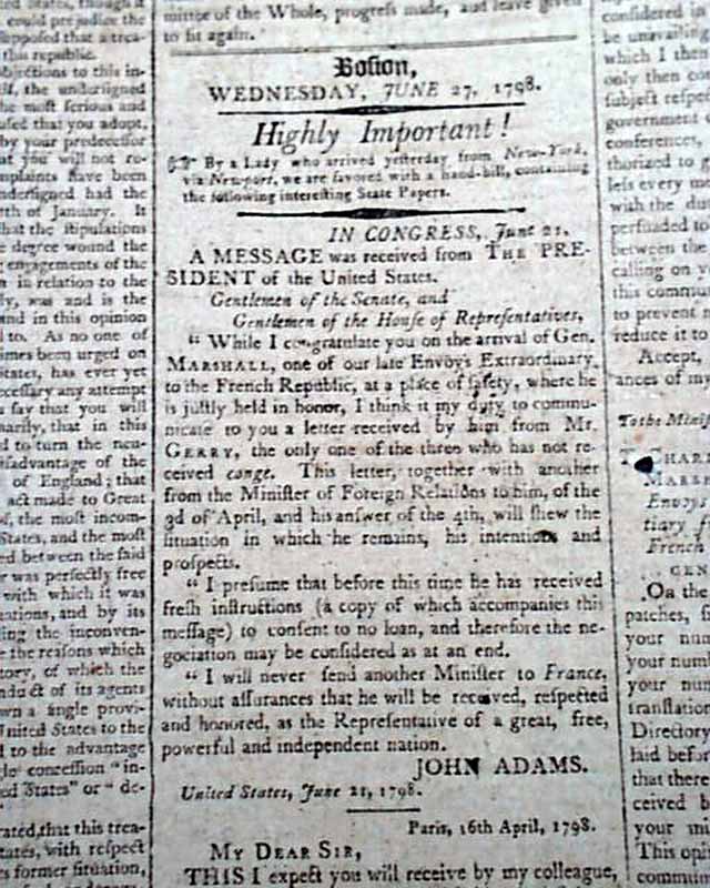 COLUMBIAN CENTINEL, Boston, June 27, 1798 The first column has a brief document signed by the President: John Adams, as an introduction to a lengthy document regarding the XYZ Affair and relations with France.
