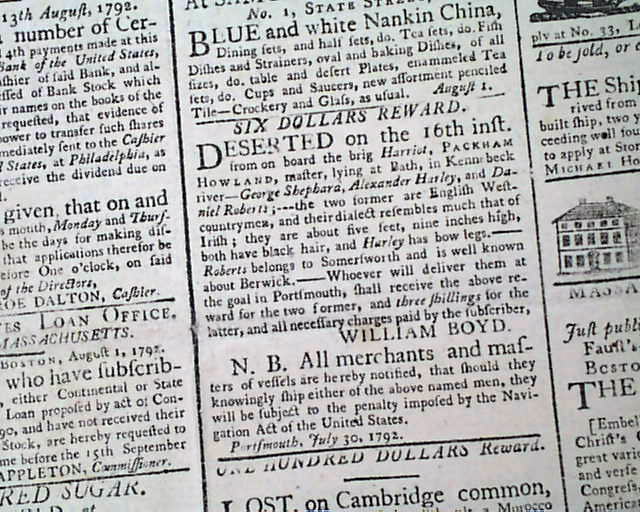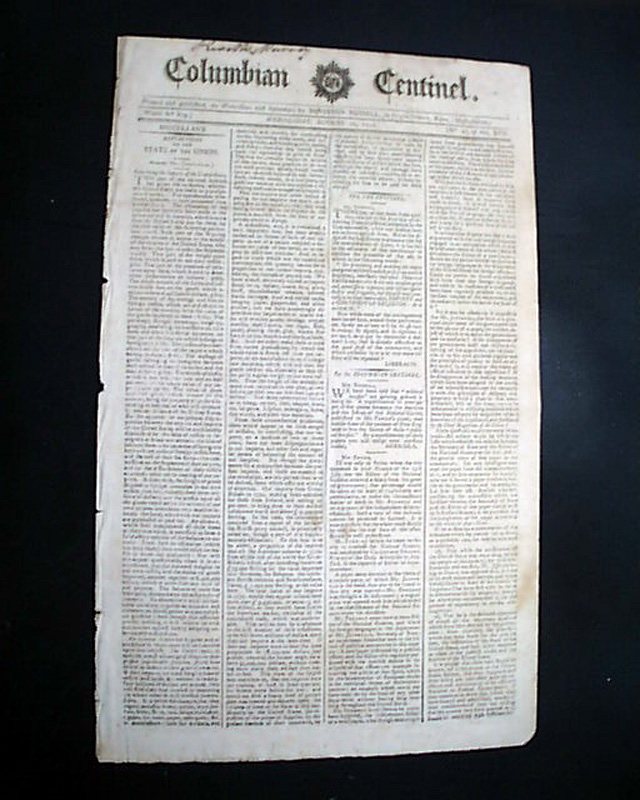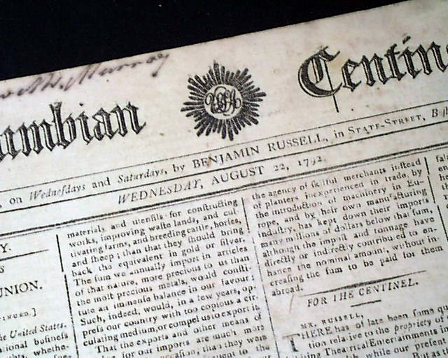 COLUMBIAN CENTINEL, Boston, Aug. 22, 1792 Over half of the front page is taken up with a continued series of articles headed: "Reflections on the State of the Union". Page 3 has a report concerning Lafayette, and the back page has an ad for a: "Six Dollars Reward" for a deserted soldier.