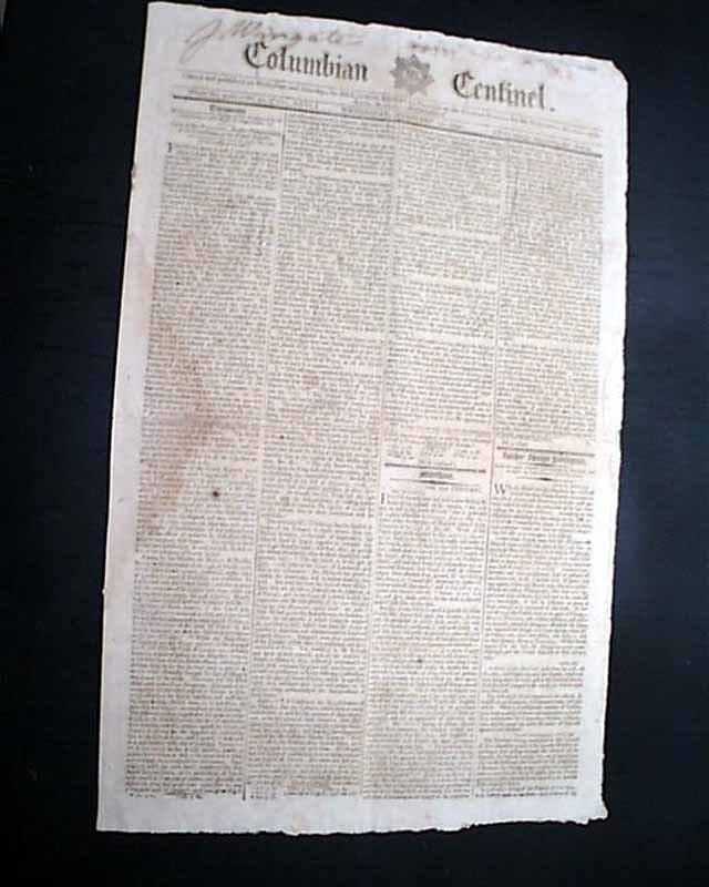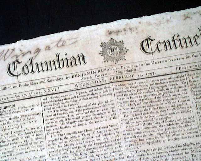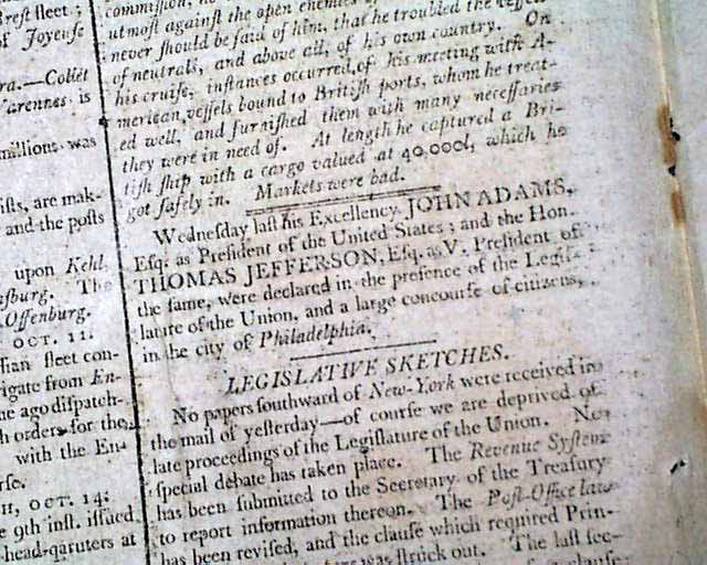 COLUMBIAN CENTINEL, Boston, Feb. 15, 1797  A page 2 report has a very historic report: "Wednesday last his Excellency JOHN ADAMS, Esq., as President of the United States; and the Hon. THOMAS JEFFERSON, Esq., as V. President of the same, were declared in the presence of the Legislature of the Union, and a large concourse of citizens in...Philadelphia." This is the first report in this paper that we've seen that official acknowledges them as having won the presidential election.