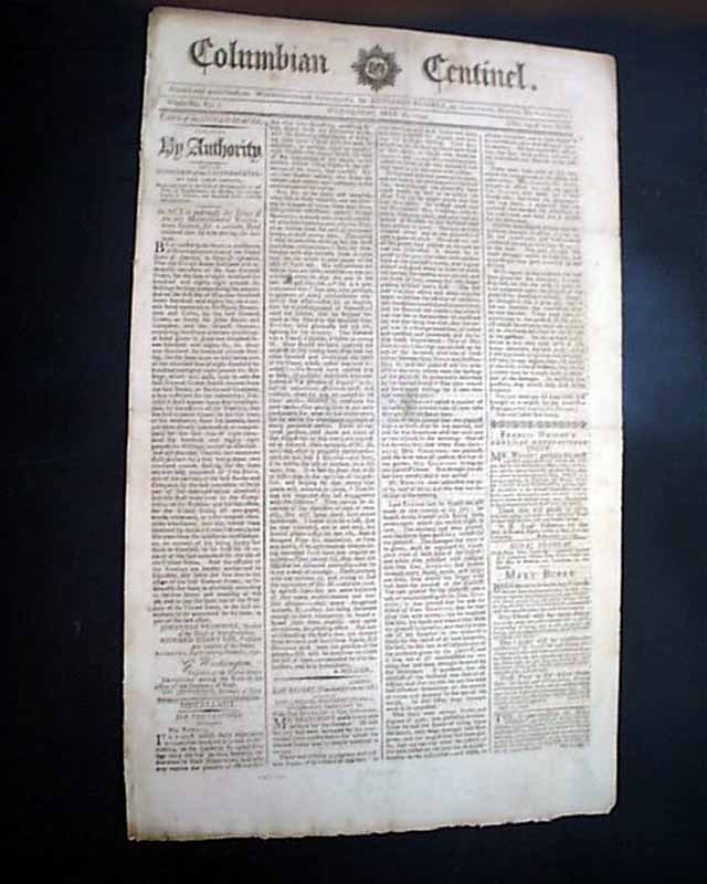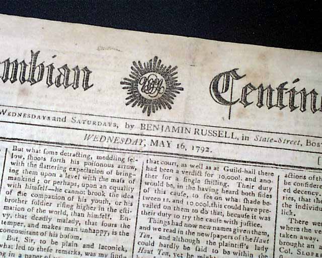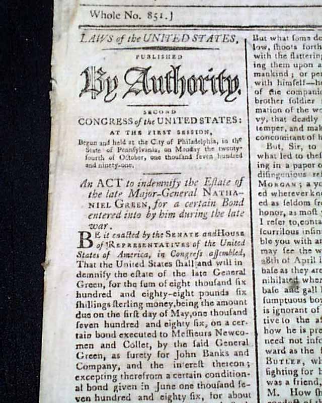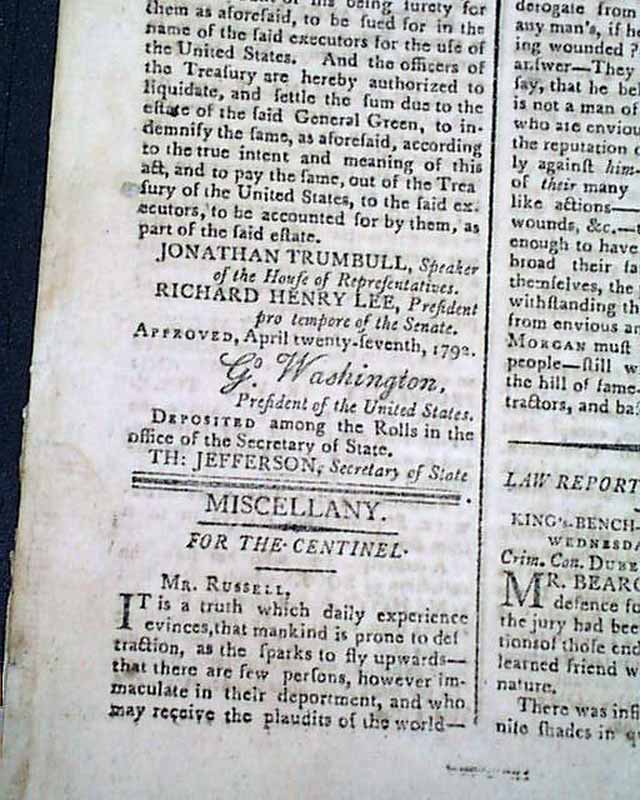COLUMBIAN CENTINEL, Boston, May 16, 1792 The front page has almost a full column Act of Congress concerning General Nathaniel Greene. It is signed in script type by the President: Go. Washington.