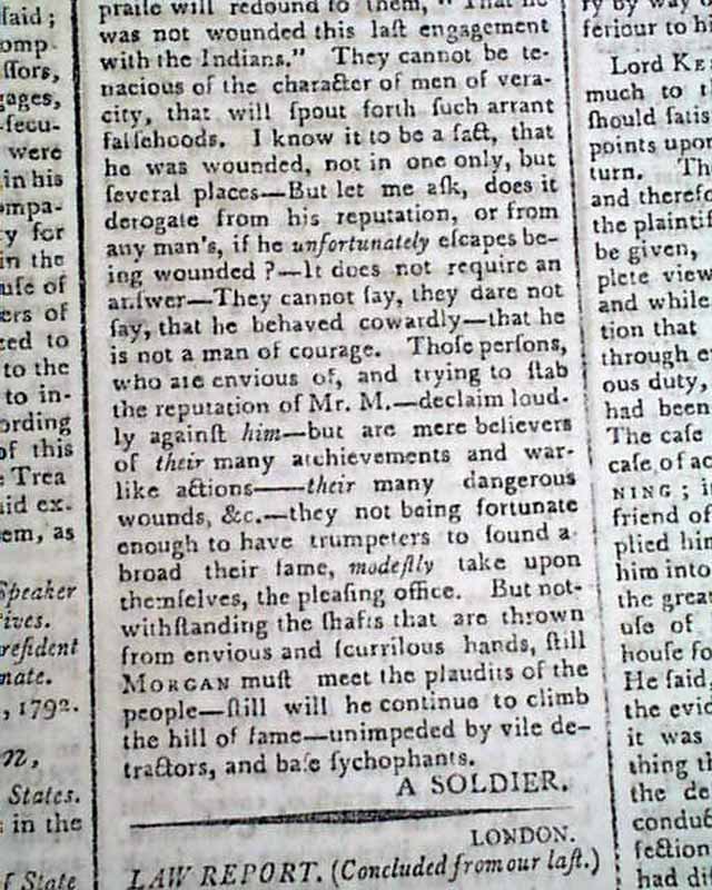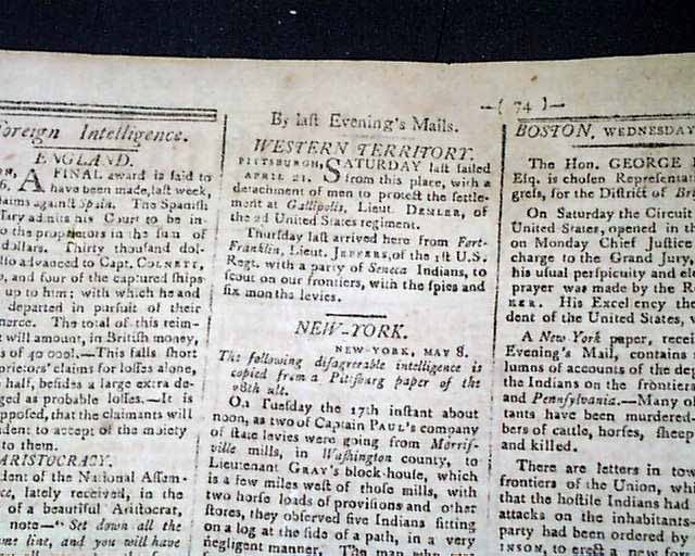 Page 2 has a report concerning trouble with the Indians in the Pittsburgh vicinity. Another item mentions: "...from the frontiers of the Union which mention that the hostile Indians had made several attacks on the inhabitants--and that a party had been ordered by Gen. Wilkinson, to erect a new fort between fort Jefferson and fort Washington."