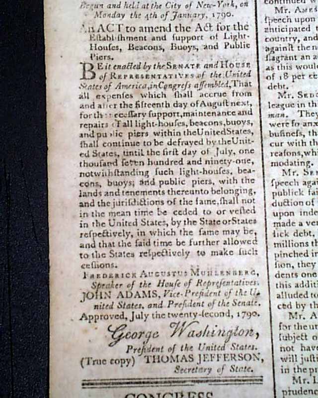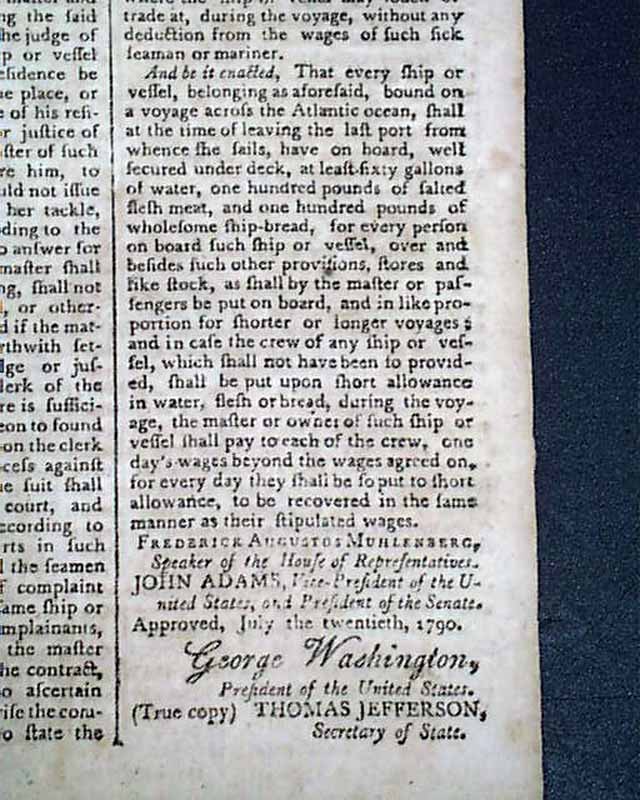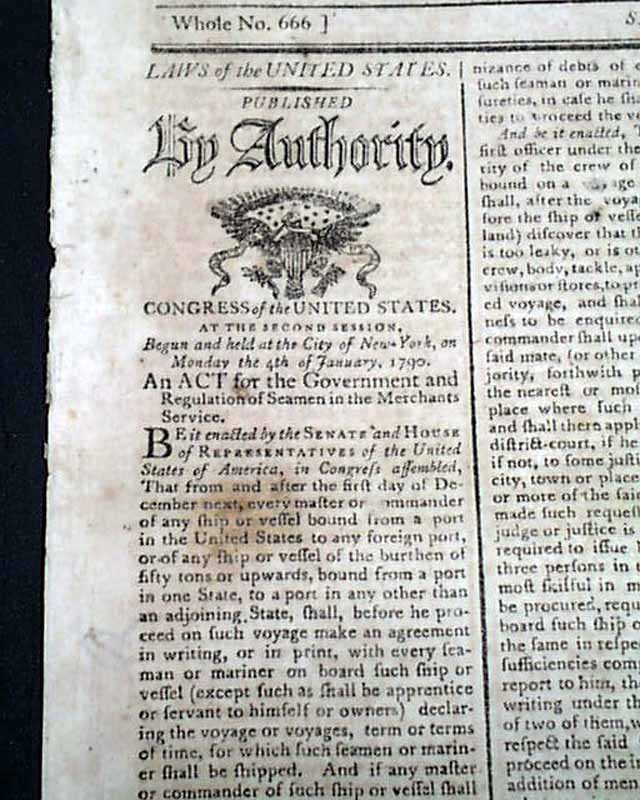 background: The dominance of this specific Act on the front page reflects the critical transition of the United States into a centralized maritime power, as the Seamen’s Act of 1790 was the first federal effort to formalize the chaotic relationship between merchant sailors and ship owners. By dedicating the entire cover to this legislation, the Columbian Centinel acted as a legal bridge for the Boston community, where the local economy lived and died by the sea; the text outlined everything from "shipping articles" (contracts) to the mandatory provisions of bread and water, effectively transforming sailors from seasonal laborers into legally protected—and bound—subjects of the new federal government. The presence of Washington's name in script type and the heraldic eagle serves as a visual "stamp of authority," signaling to a skeptical public that the brand-new Constitution was no longer just a theoretical document, but a functioning machine capable of governing the nation's most vital industry.