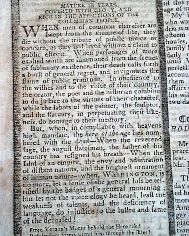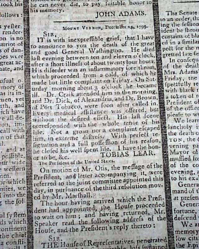 Included as well on the front page is the famous letter from Washington's private secretary, datelined at "Mount Vernon, December 15, 1799", beginning: "It is with inexpressible grief that I have to announce to you the death of the beware and good General Washington. He died last evening between ten and eleven o'clock after a short illness of about 24 hours. His disorder was an inflammatory sore throat..." with further details, meeting the attendance of Dr. Dick, Dr. Craik and Dr. Brown, then: "...Not a groan nor a complaint escaped him, in extreme distress. With perfect resignation and a full possession of his reason, he closed his well spent life." signed in type: Tobias Lear.