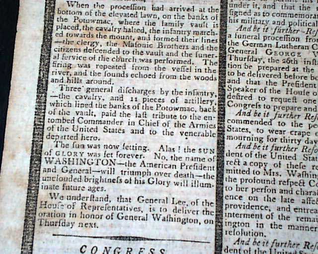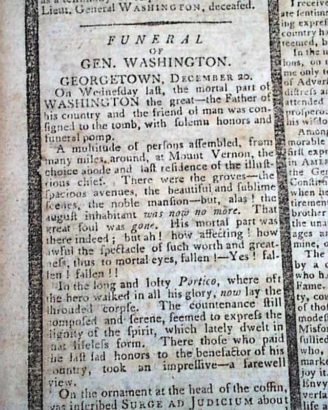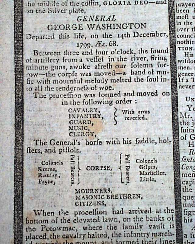 Fine content continues to take most of page 2 as well, including much headed: "Funeral Of Gen. Washington" datelined at Georgetown, Dec. 20. Included is a graphic presentation, in text, of the "corpse" with the pall bearers at its side.