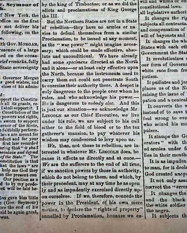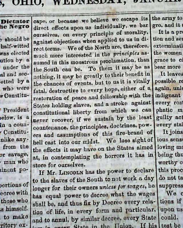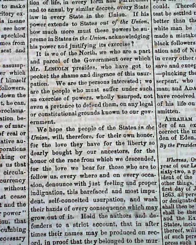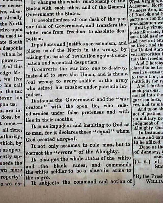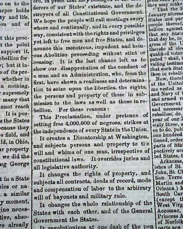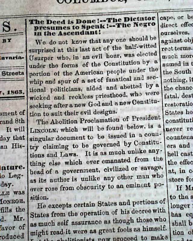 Done! The Dictator Presumes to Speak! The Negro in the Ascendant!" and the text begins: "We do not know that any one should be surprised at this last act of the half-witted Usurper who, in an evil hour, was elected under the forms of the Constitution by a portion of the American people under whip & spur of a set of fanatical & sectional politicians..." and further on: "...Now, if Mr. Lincoln, under the assumption of the 'war power', a power which exists only in the imaginations of himself and his fanatical and brainless followers..." and so much more. Truly a terrific & lengthy editorial taking two and one-third columns.