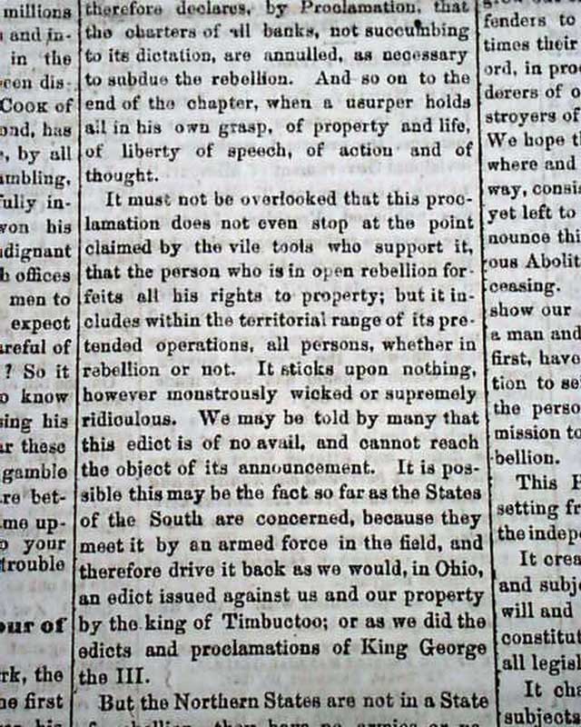 This being a pro-South newspaper, despite being printed in the North, the editor gives a vitriolic response to Lincoln's Proclamation. It is headed: "The Deed is