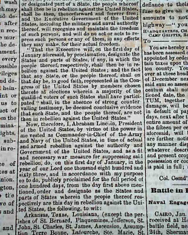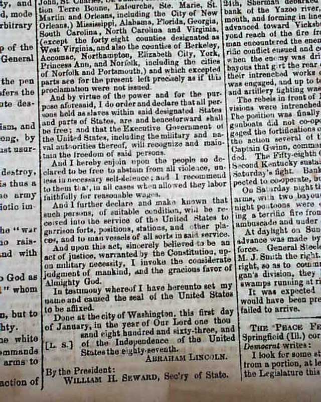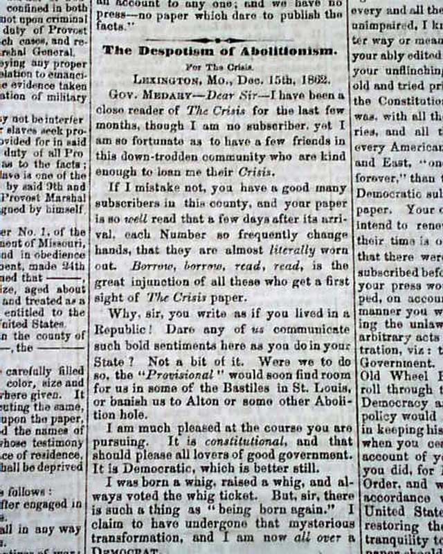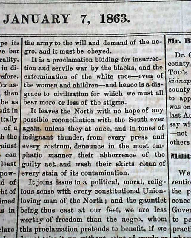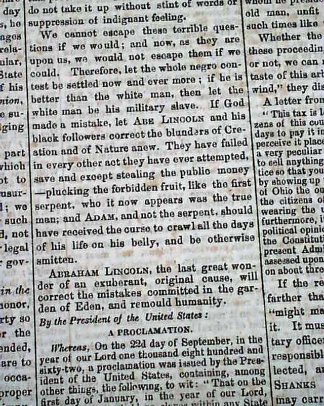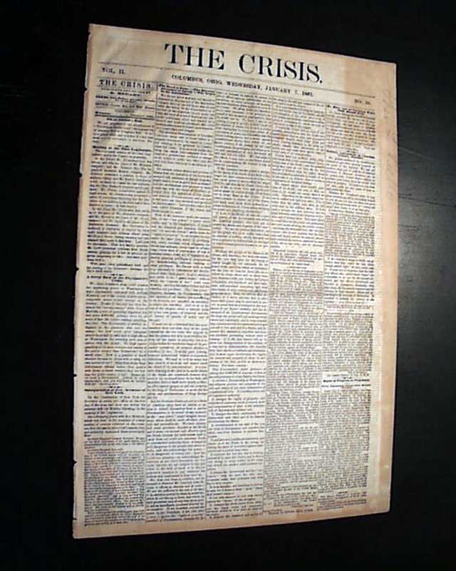 THE CRISIS, Columbus, Ohio, Jan. 7, 1863 A terrific issue, as the front page contains a printing of Lincoln's famous Emancipation Proclamation by which he freed the slaves in the slave-holding states, signed by him in type: Abraham Lincoln.