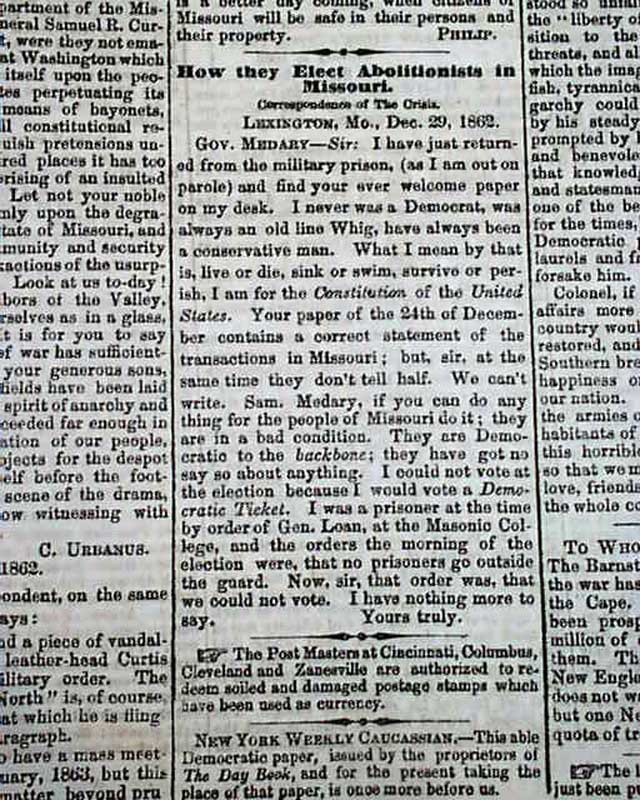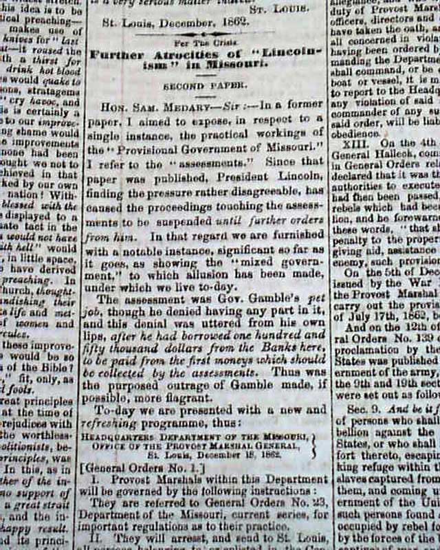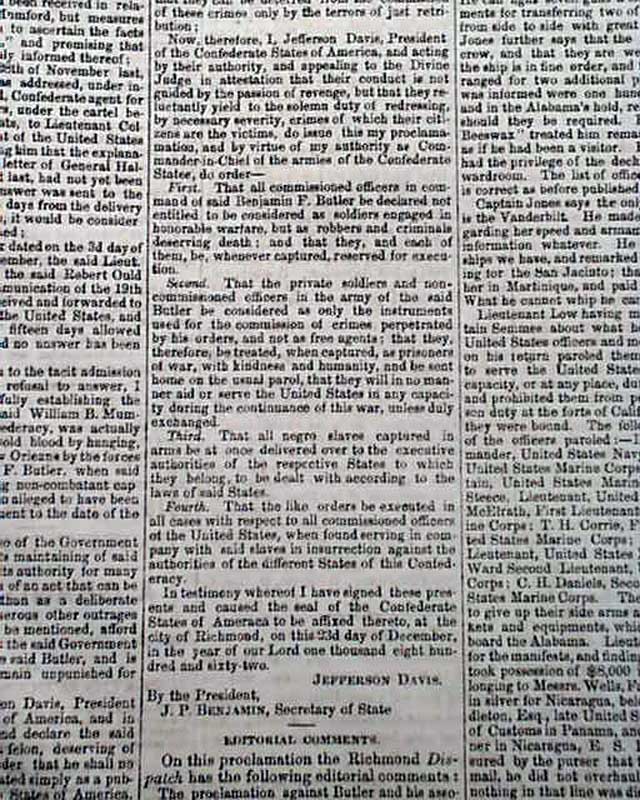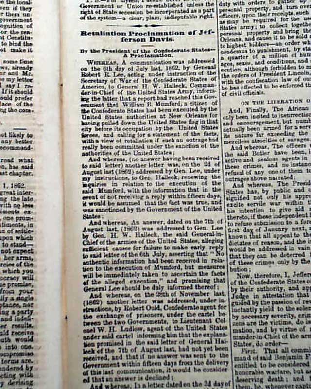 The balance of the issue is replete with much war-related reports although they pale in comparison with the front page content. Included: "Battle in Progress at Vicksburg" "Further Atrocities of 'Lincolnism' in Missouri" "The Horrors of Missouri" "The Despotism of Abolitionism" " "Petition to Prevent Negroes Settling in Ohio--Push on the Good Work" "Retaliation Proclamation of Jefferson Davis" which includes: "On the Liberation of Slaves" & is signed in type: Jefferson Davis.