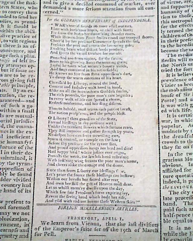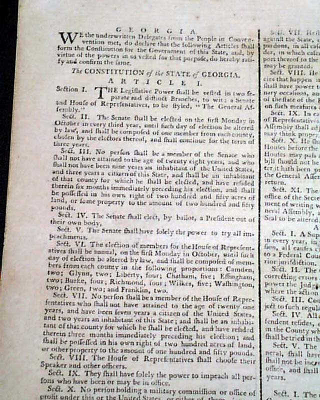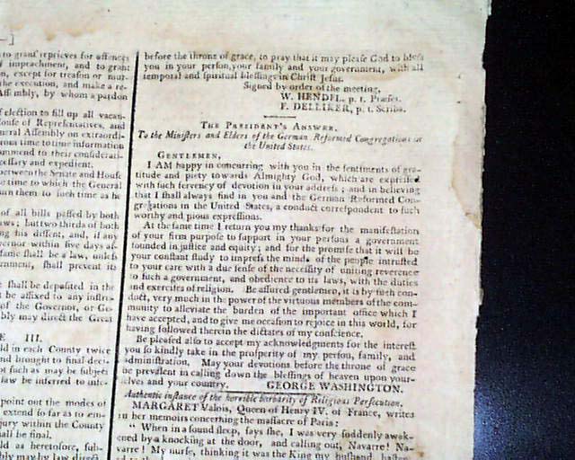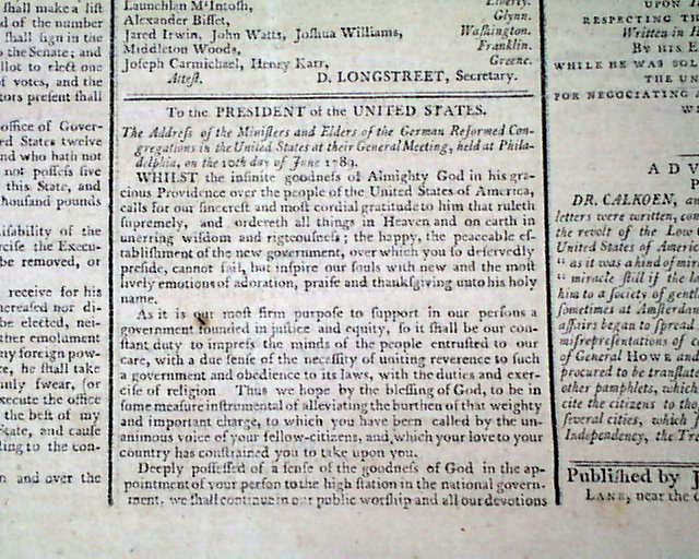 Most of the back page is taken up with a printing of: "The Constitution of the State of Georgia". It also contains an address of the German Reformed Congregations in the United States to the President of the United States, followed by: "The President's Answer" signed in type: George Washington. Page 2 has a poem: "For the Glorious Anniversary of Independence".