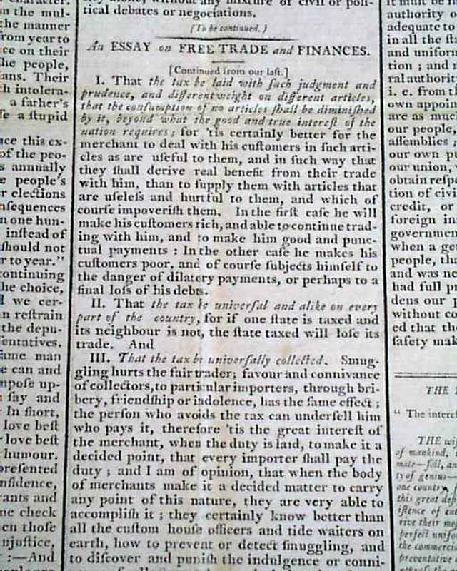 There is also an article on celebrations of the: "Anniversary of Independence". The back page includes a continued article: "An Essay on Free Trade & Finances".
