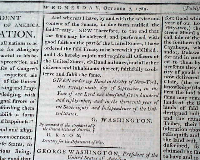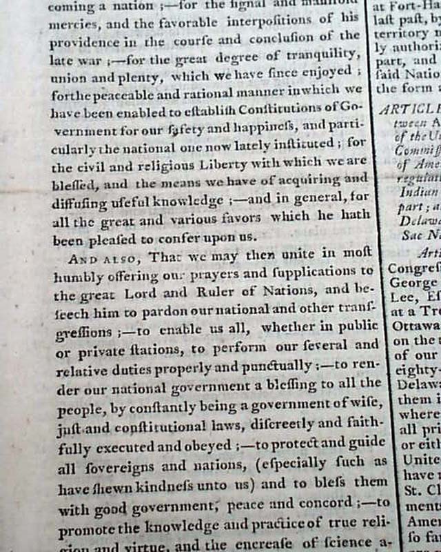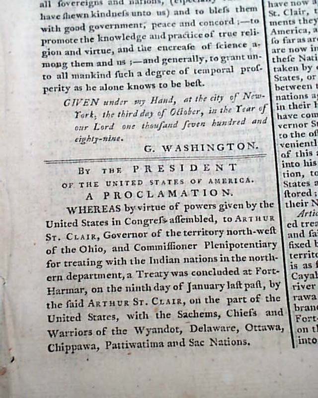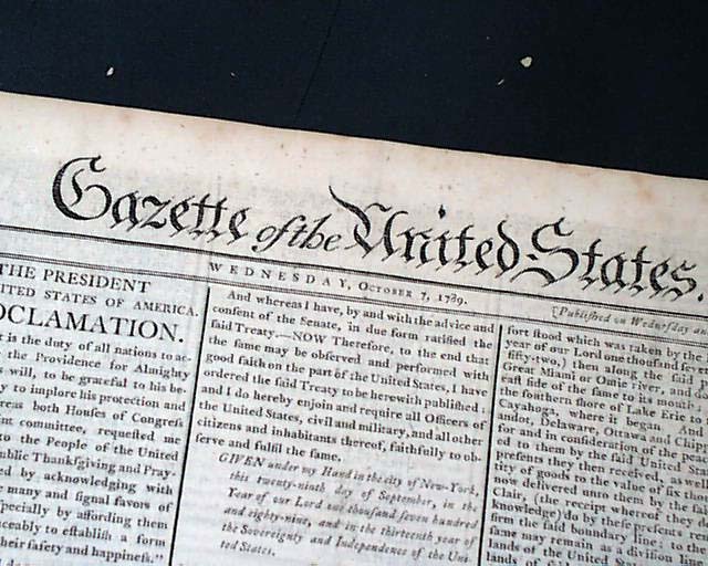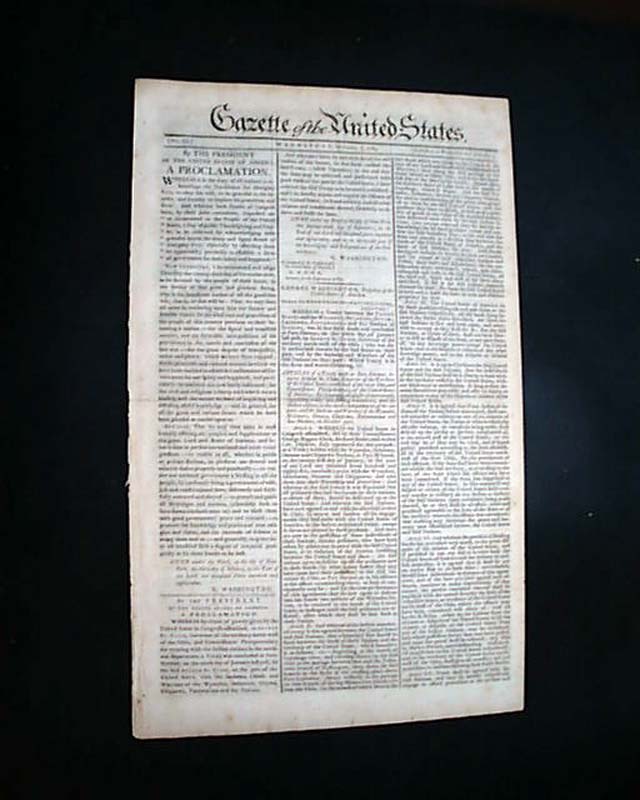 GAZETTE OF THE UNITED STATES, New York, Oct. 7, 1789 The front page begins with arguably one of the most significant Presidential Proclamations of the post-Revolutionary War era: Washington's Thanksgiving Day proclamation dated October 3, 1789. An extremely notable Proclamation to have on the front page of the newspaper that was the mouthpiece of federal government.