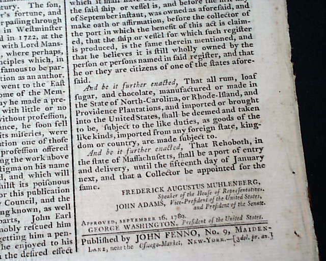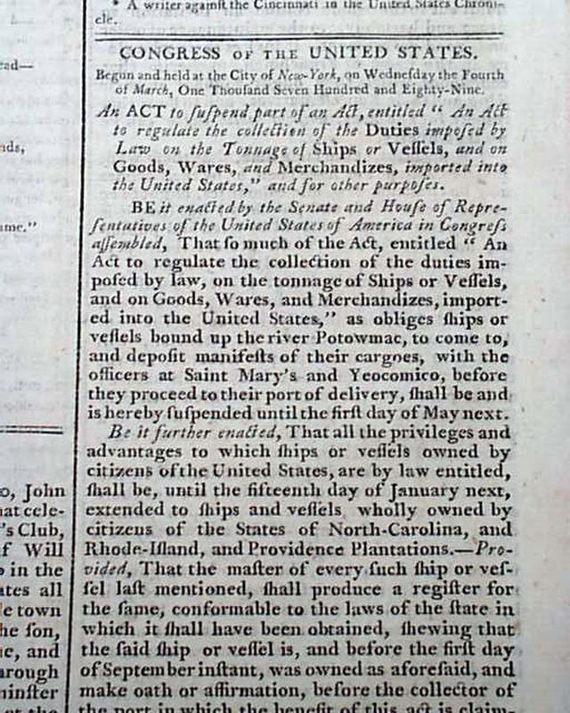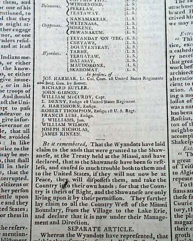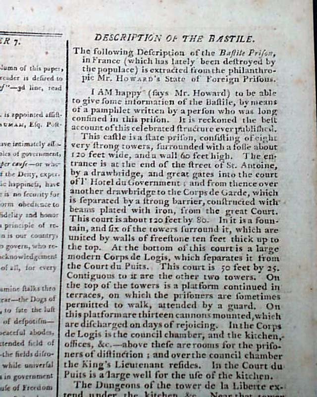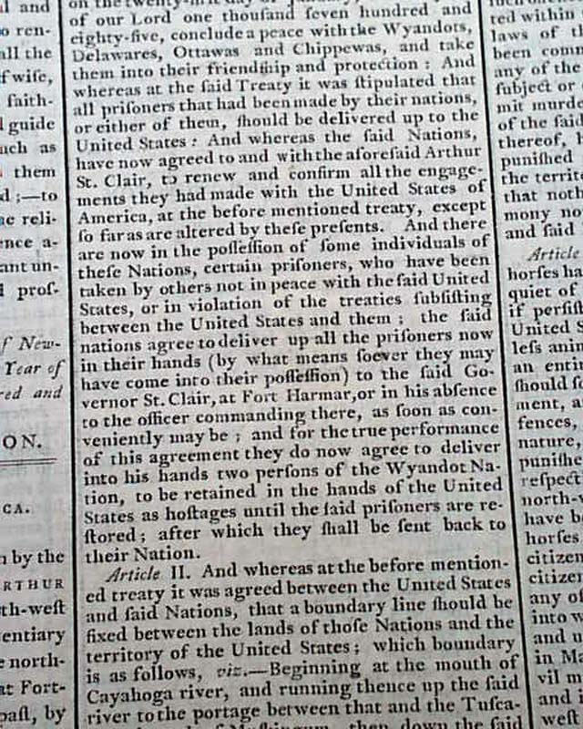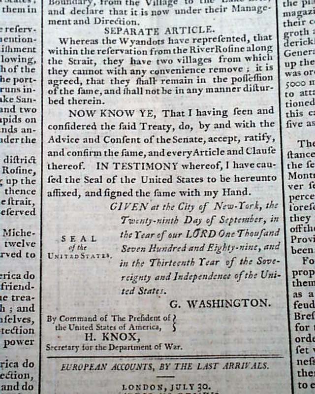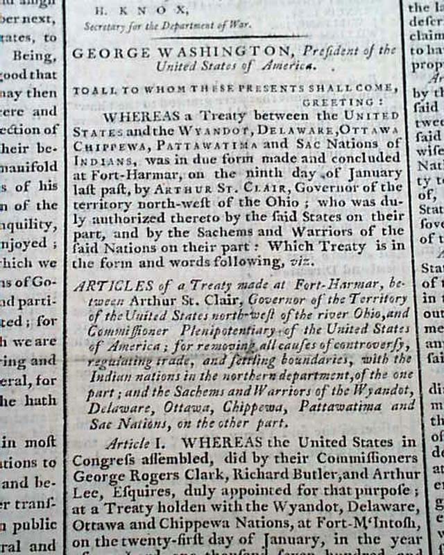 Although they pale in comparison, there are several other reports in this issue of significance including a printing of the Treaty of Fort Harmar between the United States and the Wyandot, Delaware, Ottawa, Chippewa, Pattawatima, and Sac Indian nations, signed in type by G. Washington; a report from London about an “African Genius”; an article: "Description of the Bastille" in Pars, recently destroyed with the beginning of the French Revolution; a report on the proceedings of Congress, including an act to suspend part of the Tonnage Duties Act signed in type: George Washington.