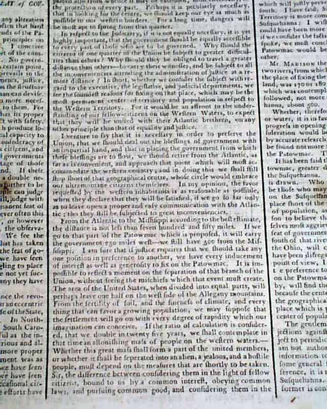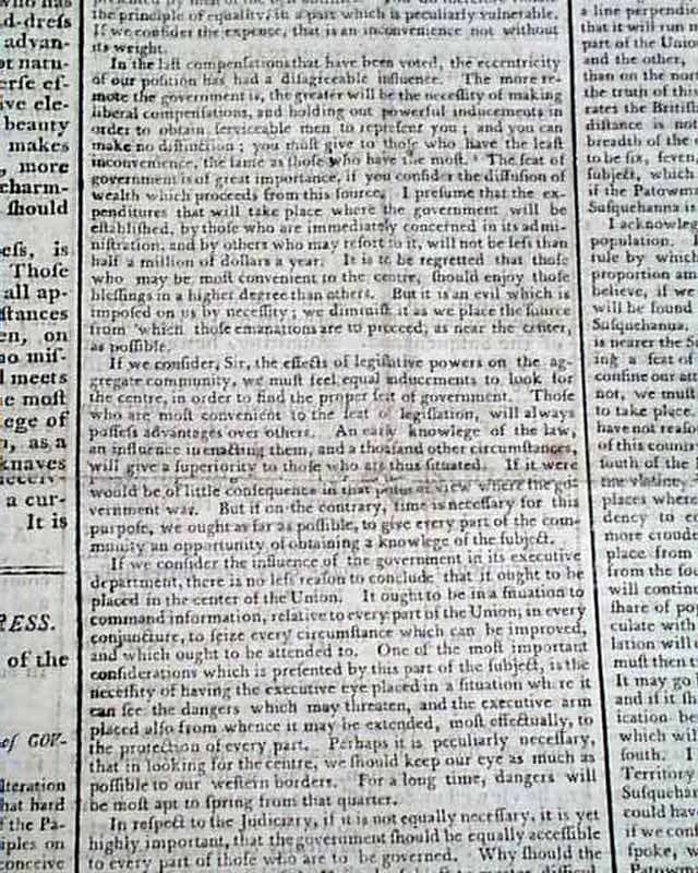 Most of pages 1 and 2 are taken up with some fascinating debates: "In the House of Representatives...on the Subject of Fixing the Permanent Seat of Government", a continued report. Interesting content on the pros & cons of various sites considered.