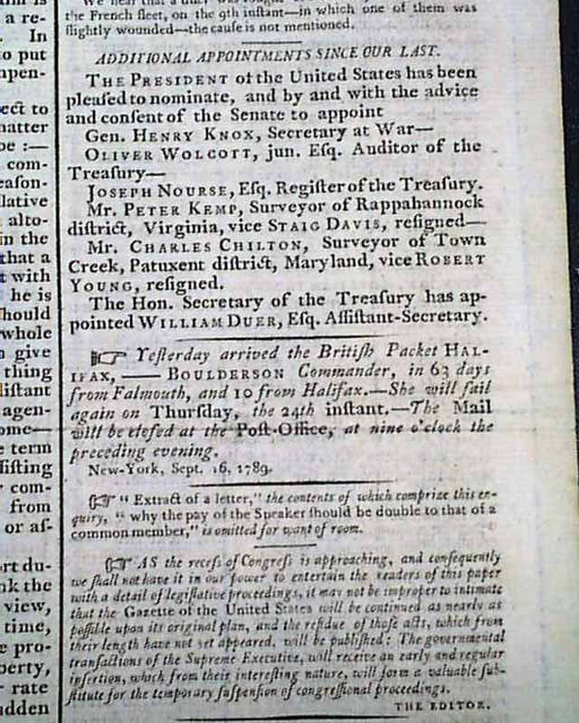 Page 3 has: "Additional Appointments Since Our Last" which includes at least one which is very notable: "The President of the United States has been pleased to nominate, and by and with the advice and consent of the Senate to appoint Gen. Henry Knox, Secretary at War..." and a few others as well.