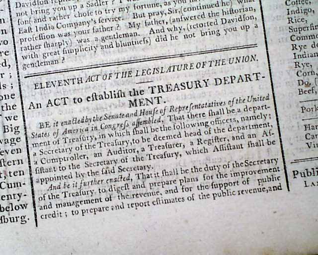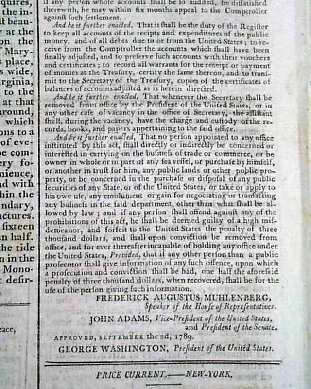 GAZETTE OF THE UNITED STATES, New York, Sept. 16, 1789 Certainly the most notable report is that found on the back page, where is printed in full: "An ACT to Establish the Treasury Department" taking nearly a full column, signed at its conclusion by the President: George Washington.