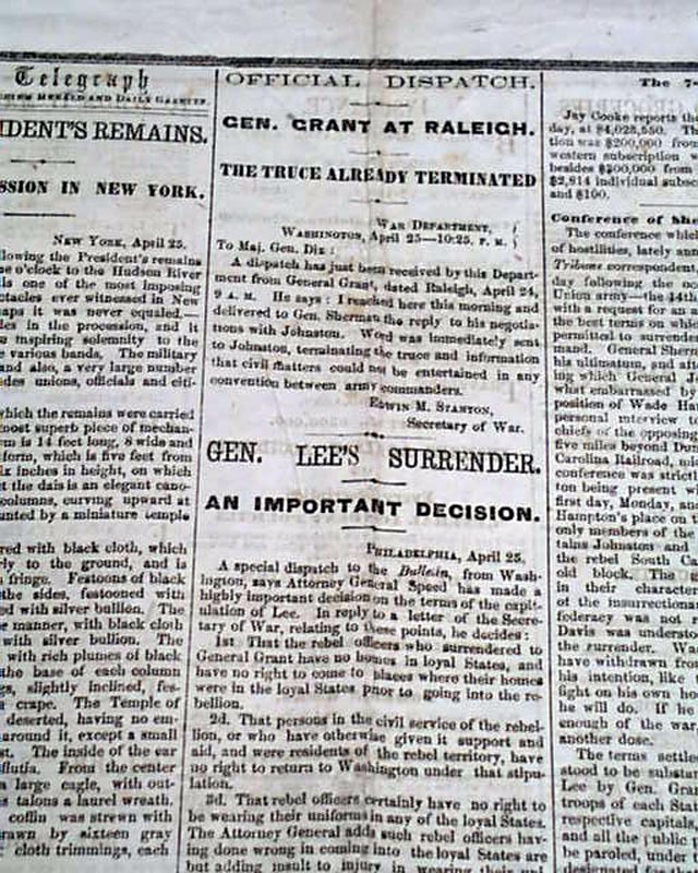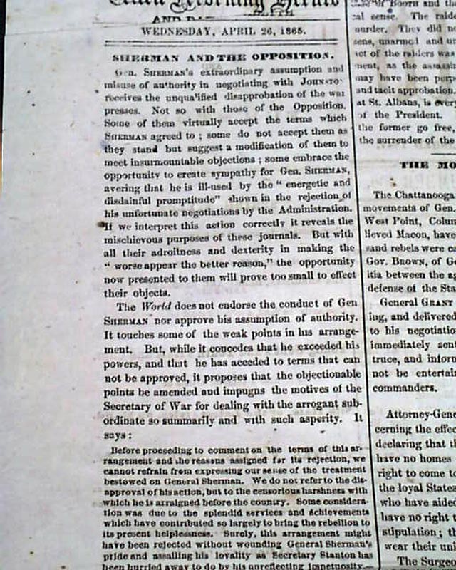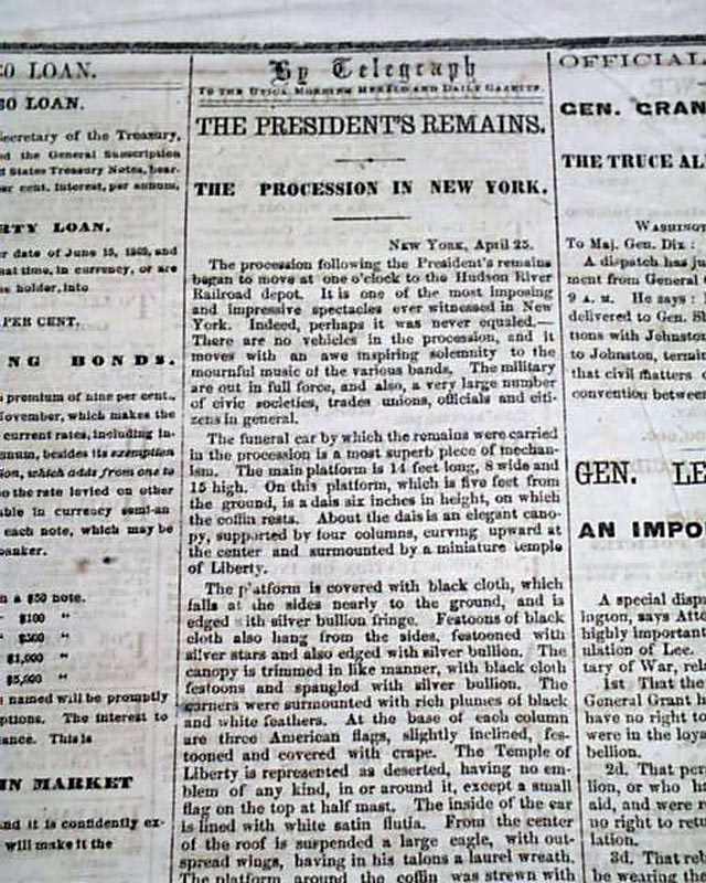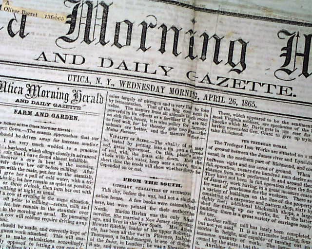 UTICA MORNING HERALD, New York, April 26, 1865 Pages 2 and 3 have reports on both the ending events of the Civil War but also on Lincoln's funeral train as it progresses to Springfield, Illinois. Photos show details.