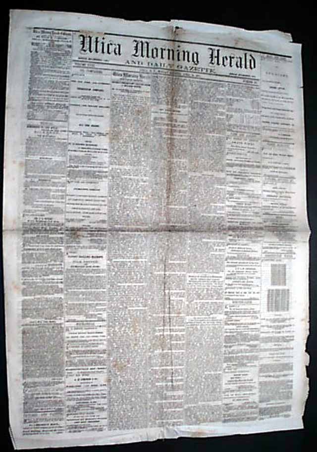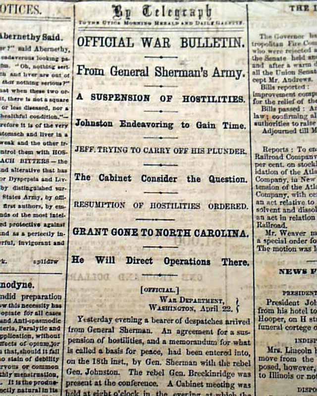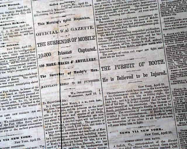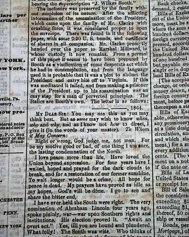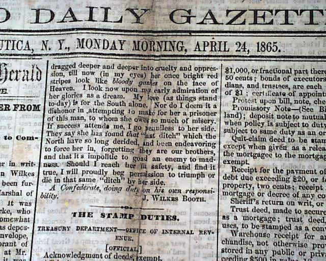 UTICA MORNING HERALD, New York, April 24, 1865 The front page has a column headed: "Highly Important Letter From J. Wilkes Booth - He Acknowledges an Intention to Commit a Desperate Act". This letter is contained in its entirely on the front page and is signed in type: J. Wilkes Booth.