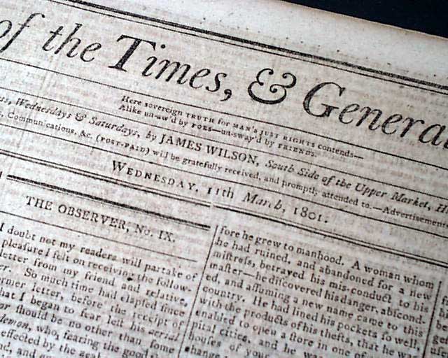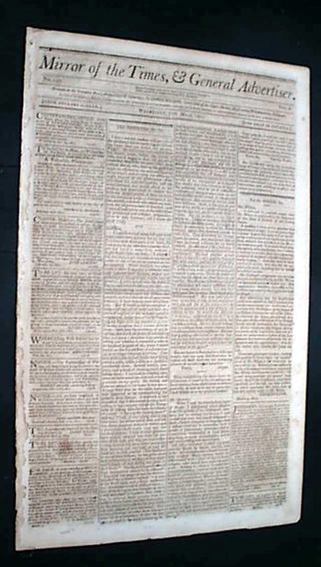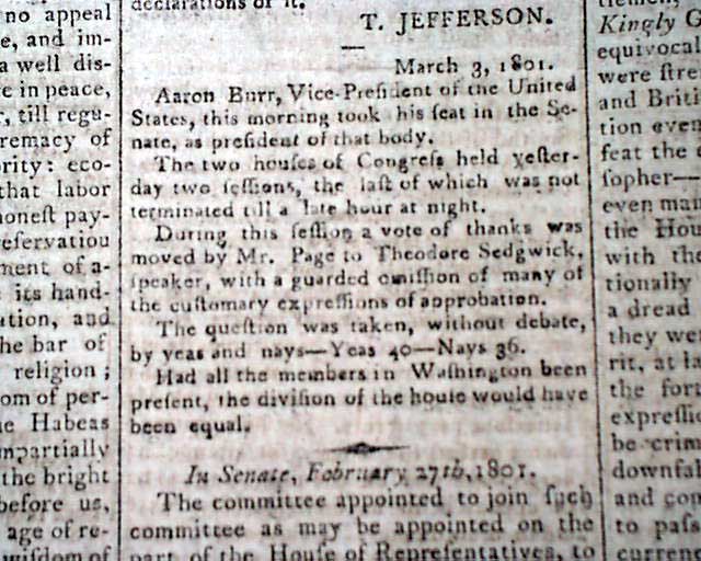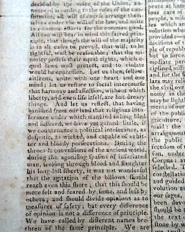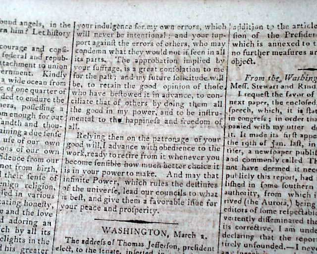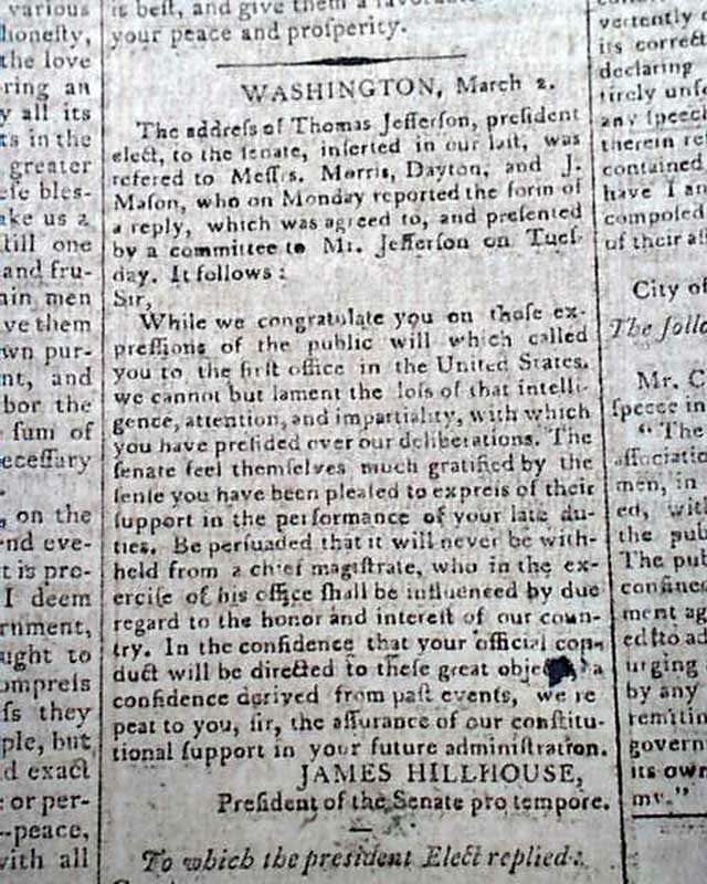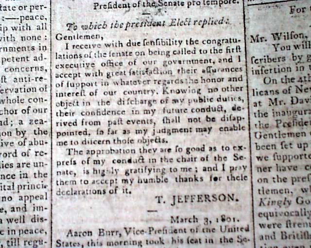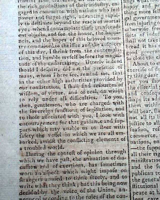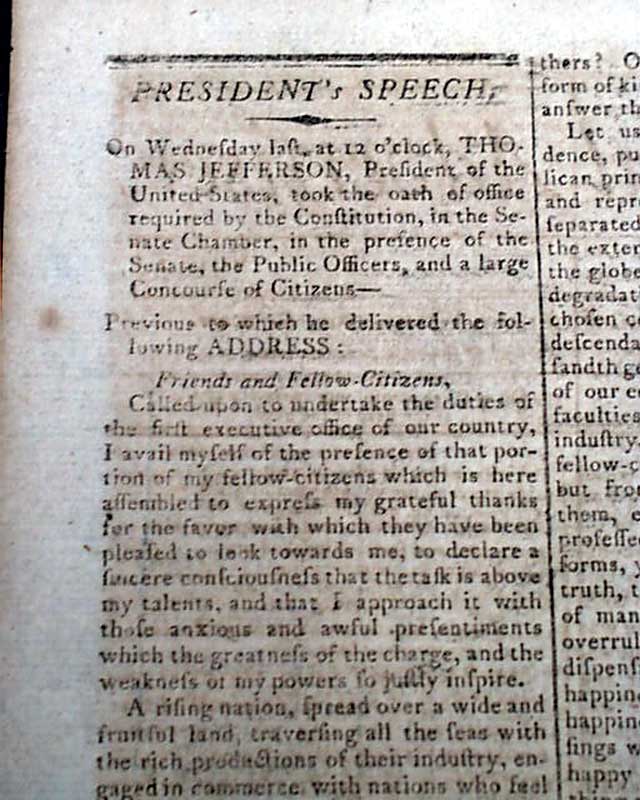 MIRROR OF THE TIMES & GENERAL ADVERTISER, Wilmington, Delaware, March 11, 1801 Over half of page 2 is taken up with Thomas Jefferson's inaugural address, headed: "PRESIDENT'S SPEECH" and prefaced with: "Wednesday last, at 12 o'clock, Thomas Jefferson, President of the United States, took the oath of office required by the Constitution, in the Senate Chamber, in the preference o the Senate, the Public Officers, and a large concourse of citizens."