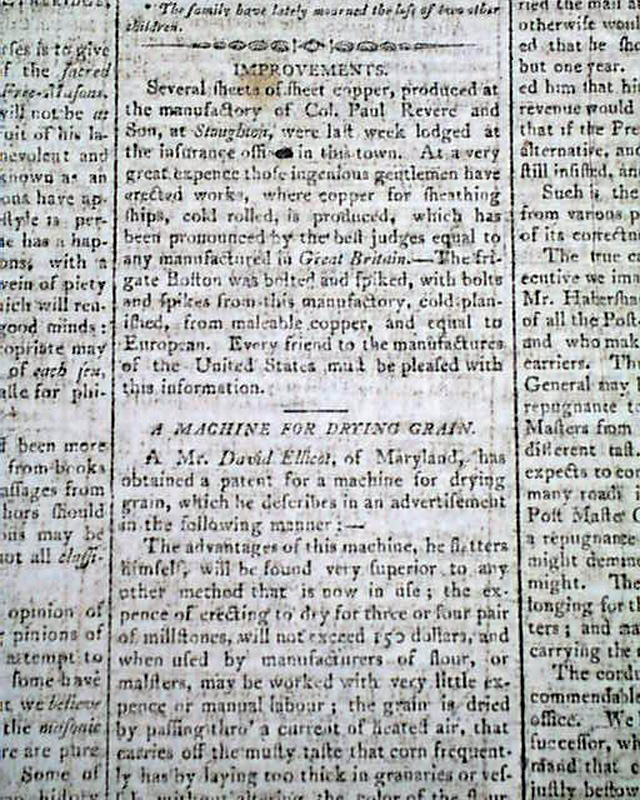 THE MERCURY & NEW ENGLAND PALLADIUM, Boston, Oct. 30, 1801  Page 2 has an interesting item praising the copper manufacturing business of Paul Revere. It notes in part: "Several sheets of sheet copper, produced at the manufactory of Col. Paul Revere and Son...At a very great expense those ingenious gentlemen have erected works, where copper for sheathing ships, cold rolled, is produced, which has been pronounced by the best judges equal to any manufactured in Great Britain. The frigate Boston was bolted & spiked with bolts and spikes from this manufactory...and equal to European...".