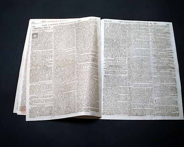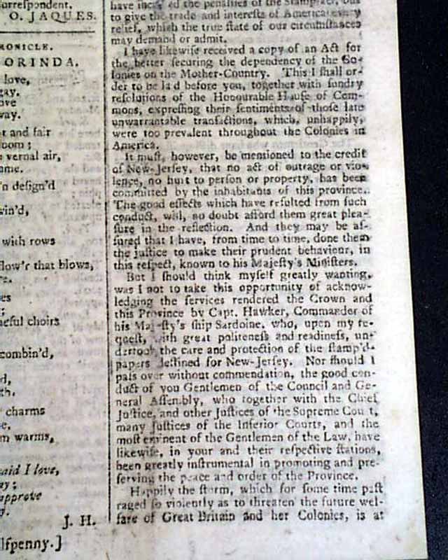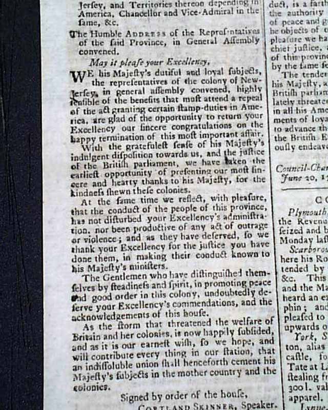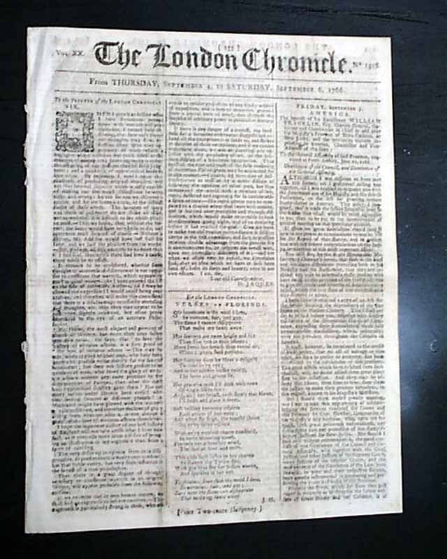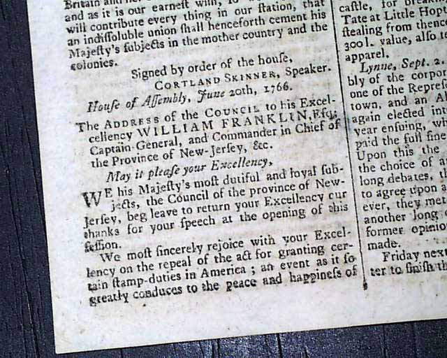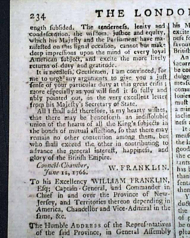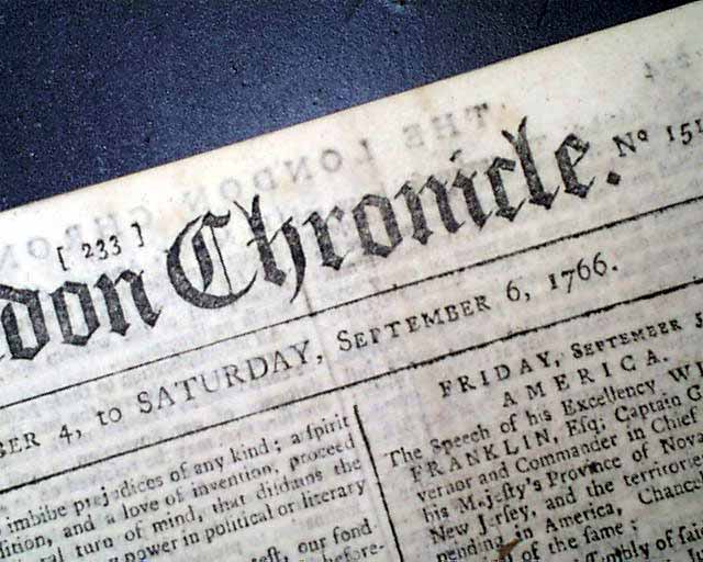THE LONDON CHRONICLE, England, Sept. 6, 1766 Pages `1 and 2 have 2 1/2 columns taken up with content which is on the repeal of the Stamp Act. It begins with a: "Speech of his Excellency William Franklin...Governor...of New Jersey". It includes a notable mention: "...It gives me great satisfaction that I have it now in my power to communicate to you an Act for the Repeal of that statute, and to present you with y sincere congratulations on the happy termination of this most important affair..." and much more.