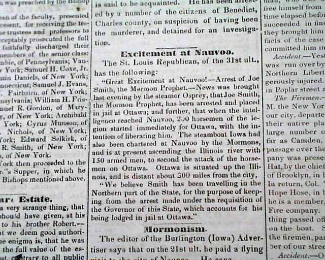 Page 2 has two early & notable reports concerning the Mormons. The first: "Excitement at Nauvoo" which includes: "...Arrest of Joe Smith, the Mormon Prophet...that Joe Smith, the Mormon Prophet has been arrested & placed in jail at Ottawa...200 horsemen of the legion started immediately for Ottawa, with the intention of liberating him..." with more.