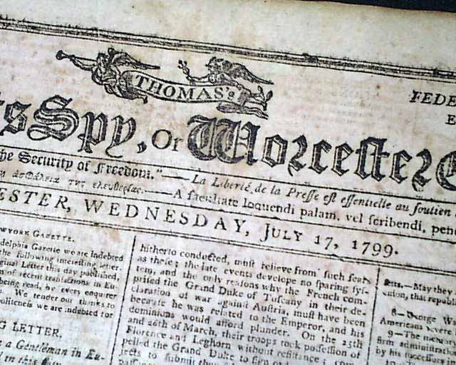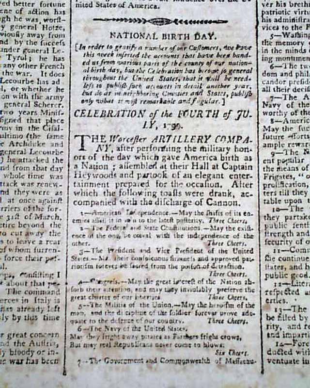 THOMAS'S MASSACHUSETTS SPY OR WORCESTER GAZETTE, July 17, 1799  The front page has: "Celebration of the Fourth of July" at Worcester, followed by the celebrations at New Salem, Lancaster & Petersham.