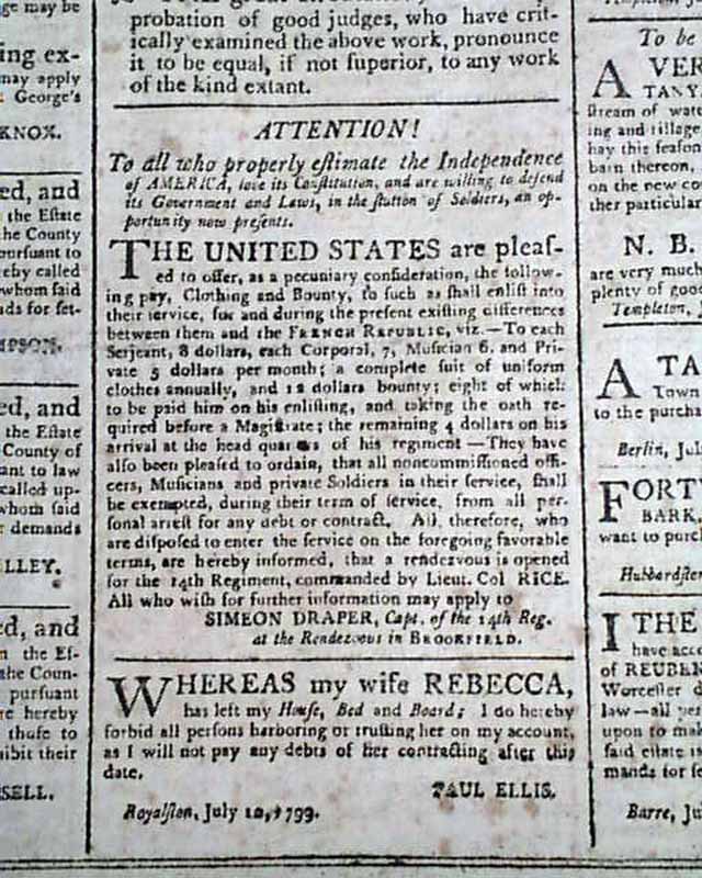 The back page has a very nice recruitment ad for the military headed: "ATTENTION ! " "To all who properly estimate the Independence of America, love its Constitution, and are willing to defend its Government & Laws, in the station of Soldiers, an opportunity now presents." following which are the enticements for joining the military.